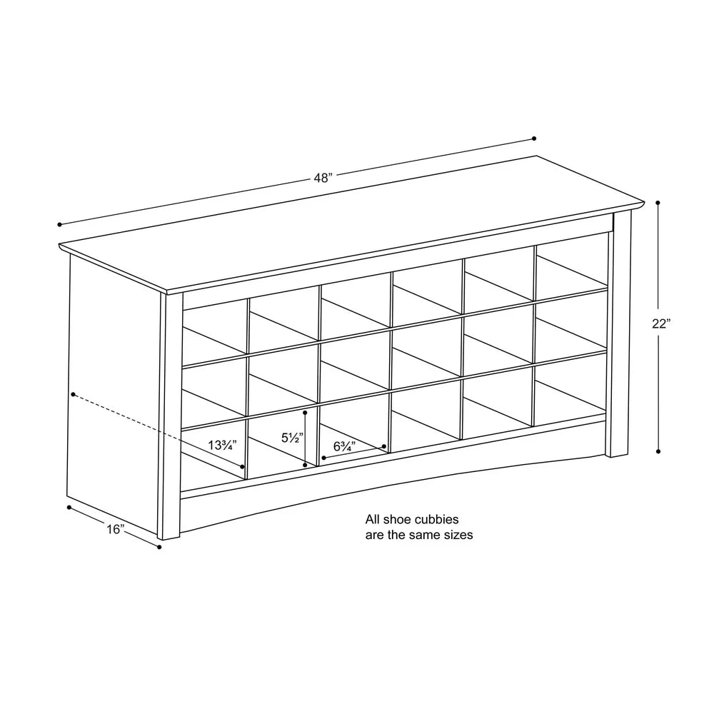 Product Description: Store your shoes where you put them on with our Shoe Storage Cubbie Bench. Dual-purposed and versatile, this bench is a great addition to your foyer, mudroom, utility room, or bedroom. Each of the 18 individual cubbies is spacious enough to hold a pair of size 13 men’s shoes, keeping them neatly stored and out of the way. It’s the perfect piece to keep your shoes organized.