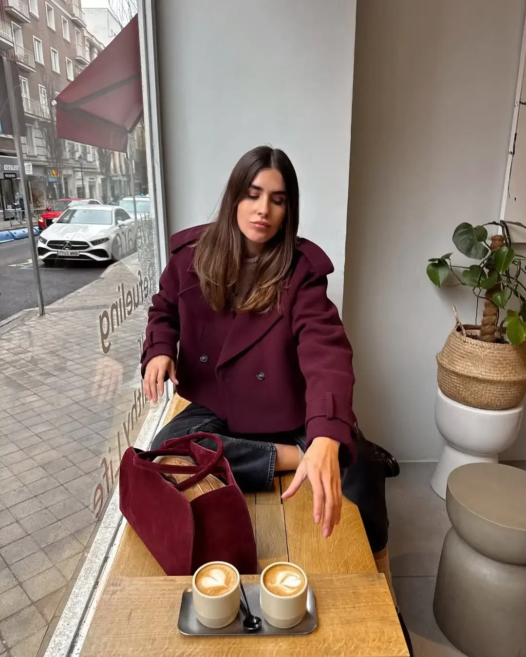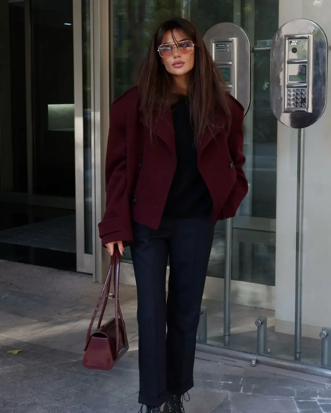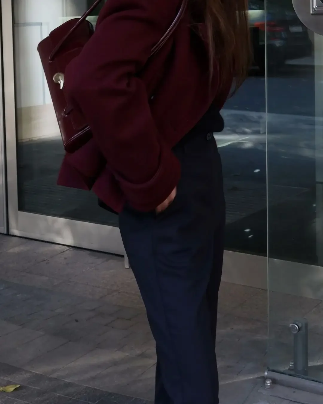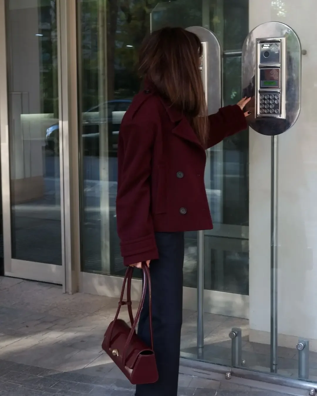 2025 Burgundy Wool Coat Off Women Fashionable Short Double Breasted Lapel Long Sleeve Elegant Autumn Commuting Outerwear Offical