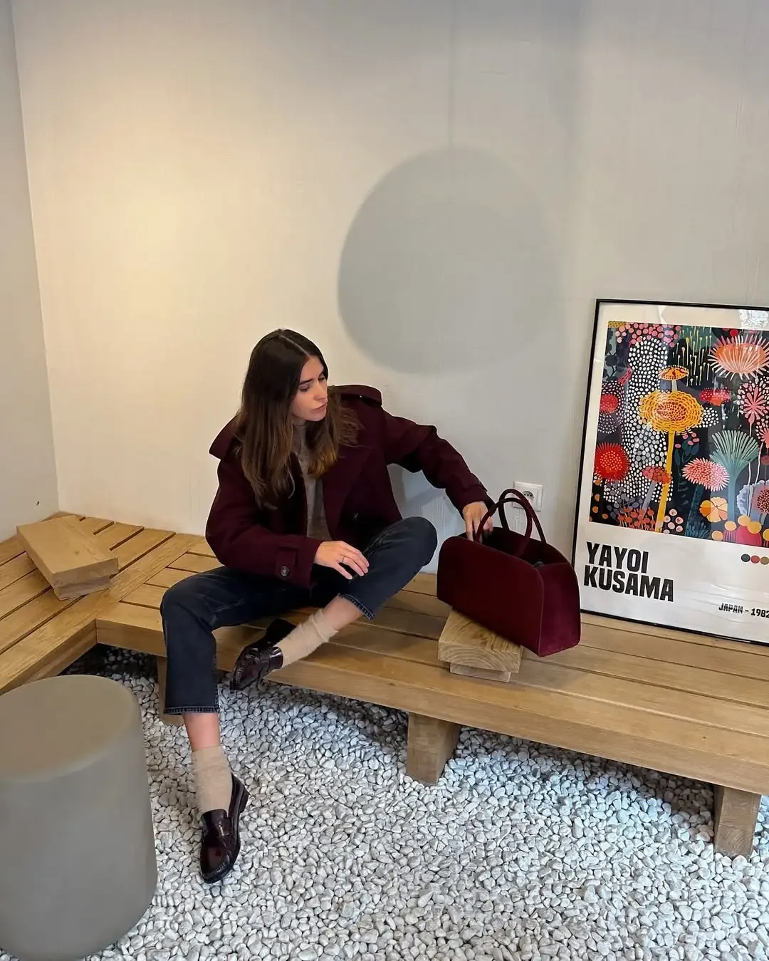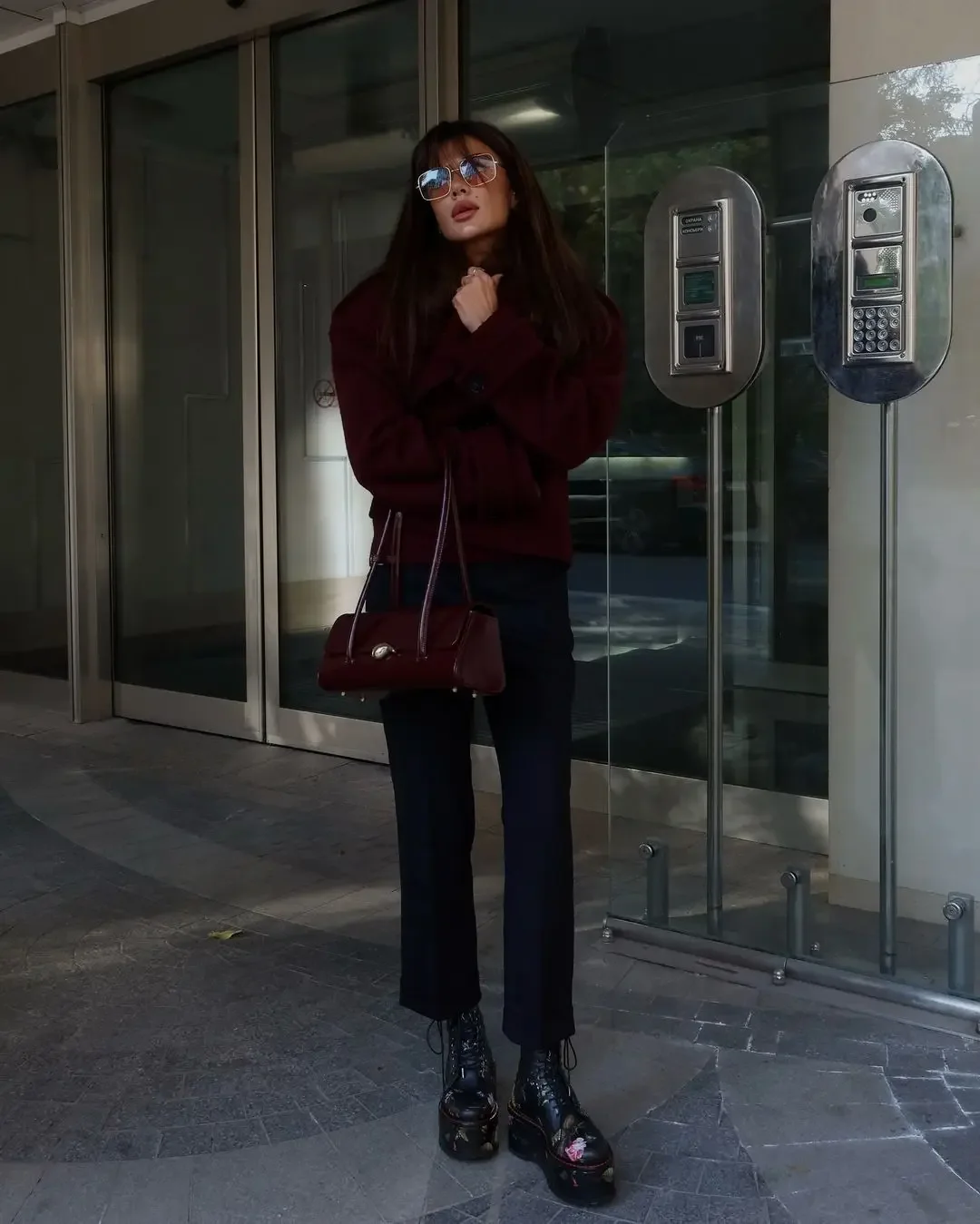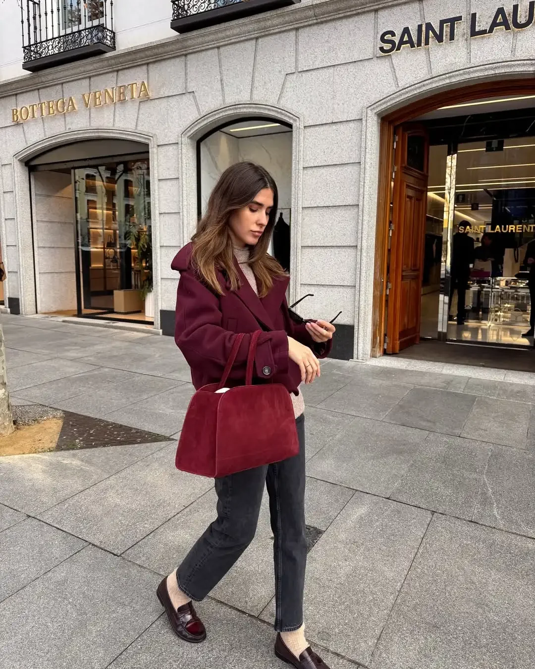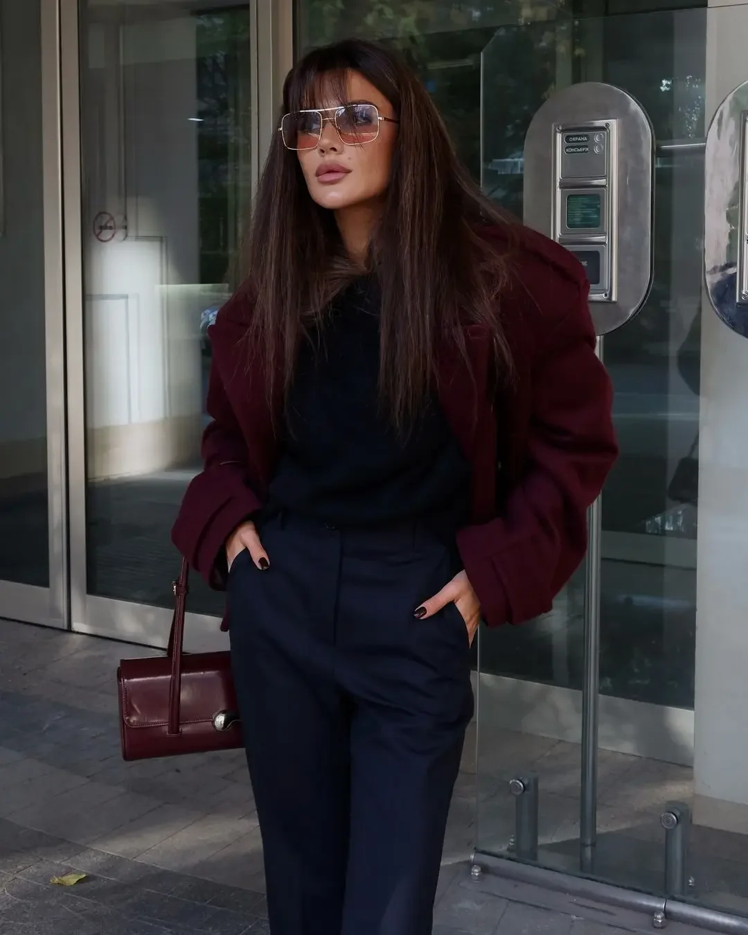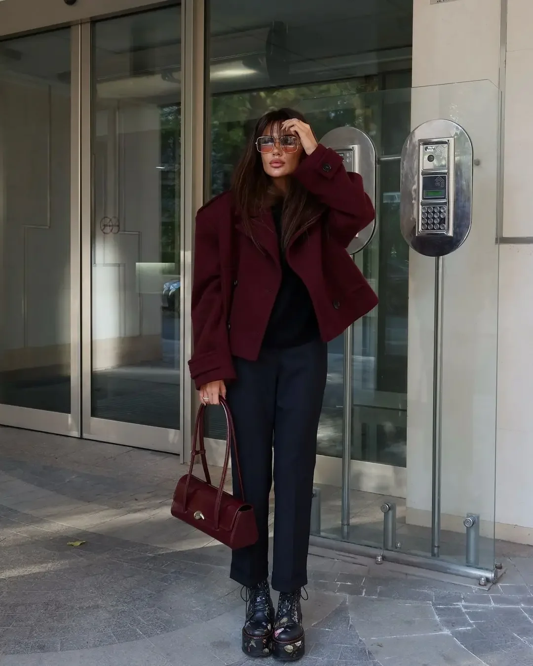 2025 Burgundy Wool Coat Off Women Fashionable Short Double Breasted Lapel Long Sleeve Elegant Autumn Commuting Outerwear Offical