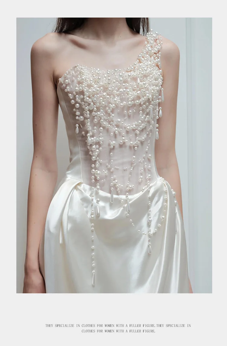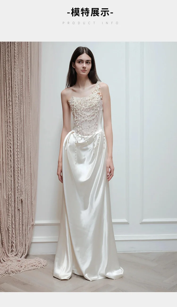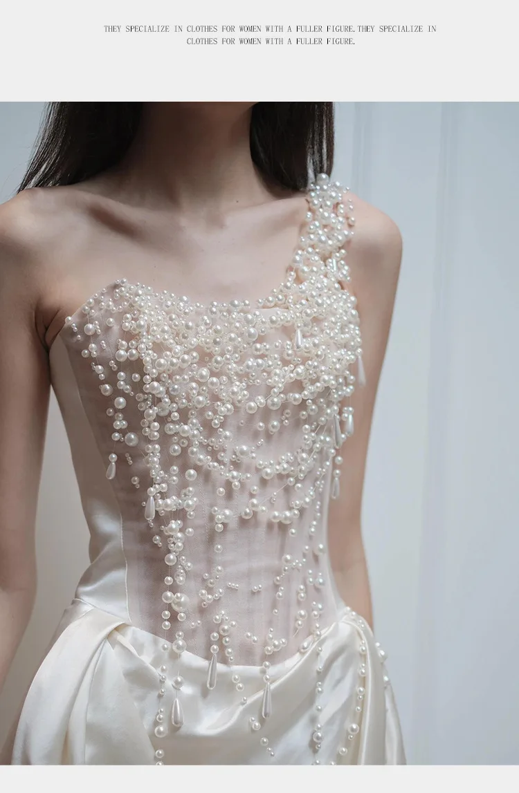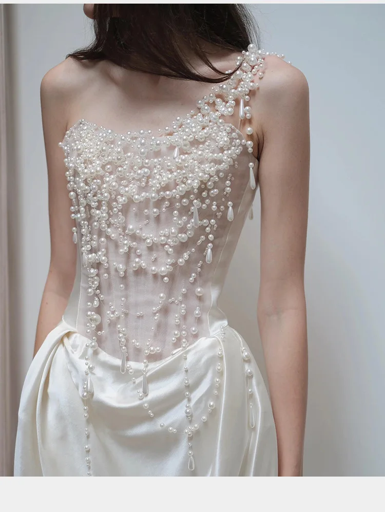2025 French Strapless Evening Dress For Brides Niche Light Luxury Satin For Going Out Heavy Industry Pearl Light Wedding Dress