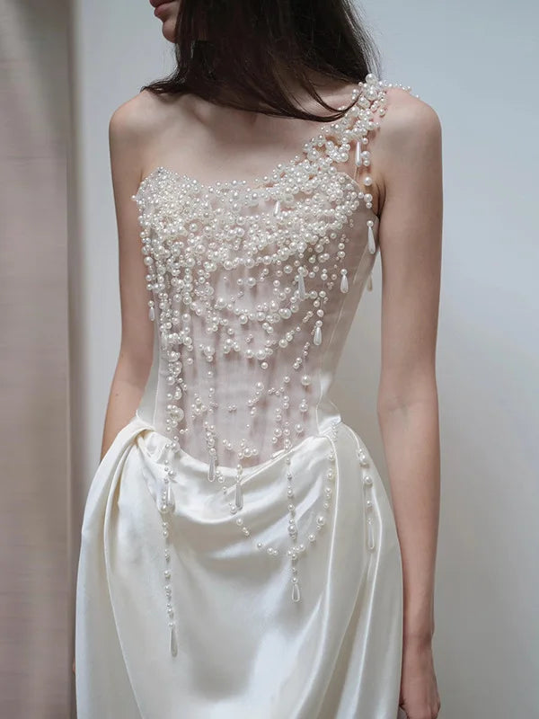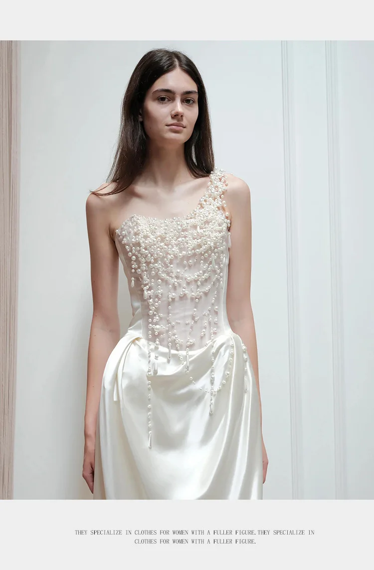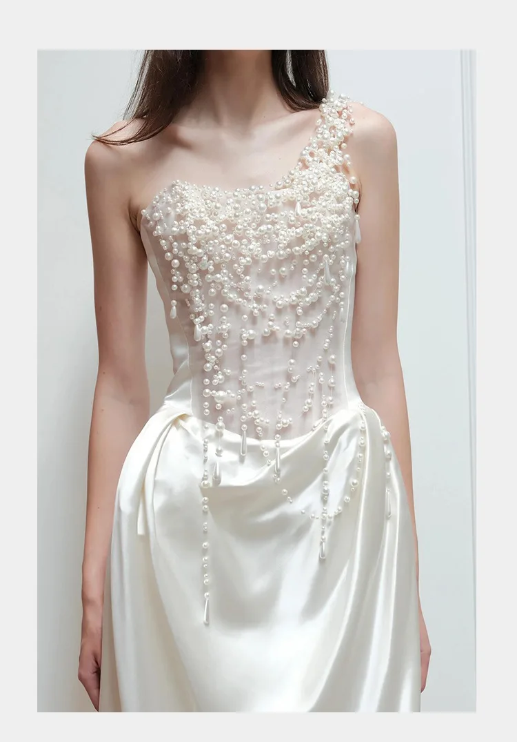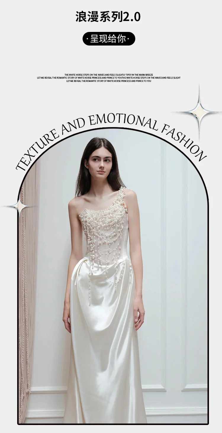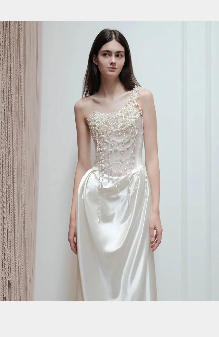 2025 French Strapless Evening Dress For Brides Niche Light Luxury Satin For Going Out Heavy Industry Pearl Light Wedding Dress