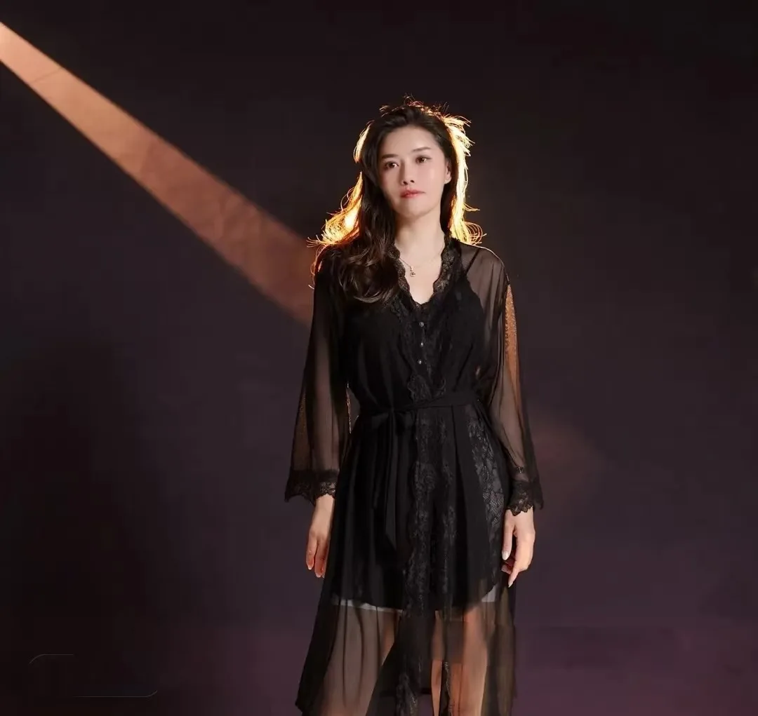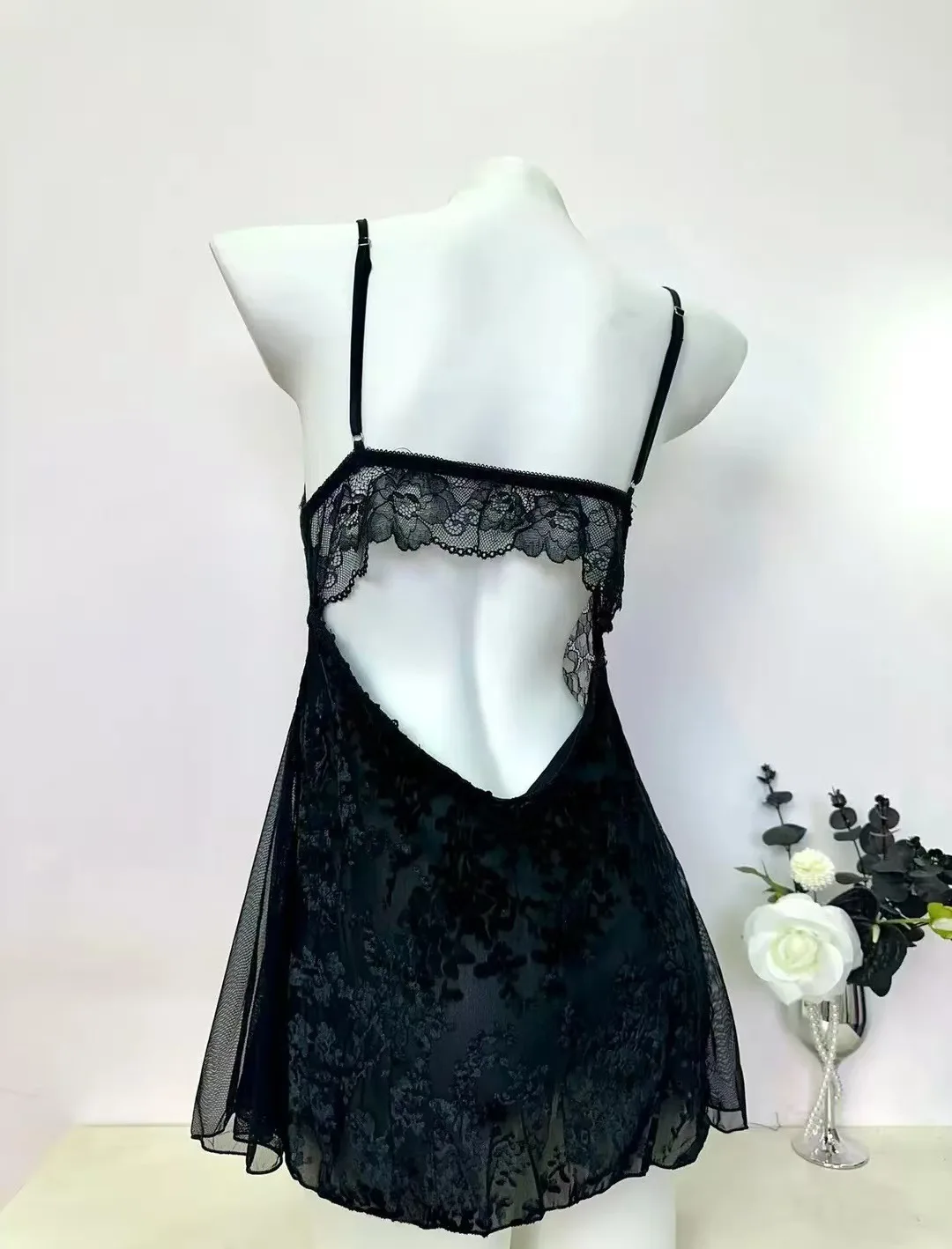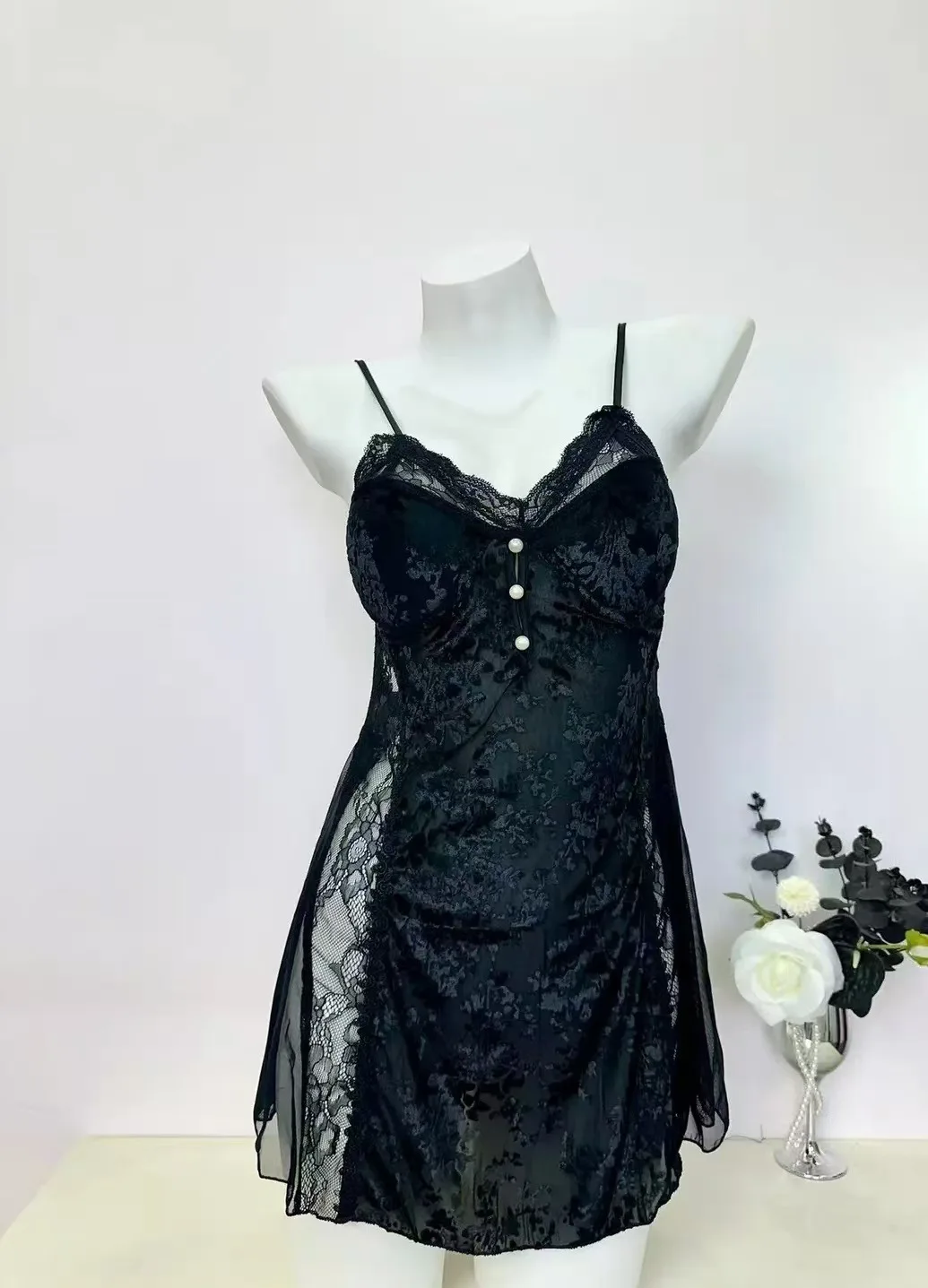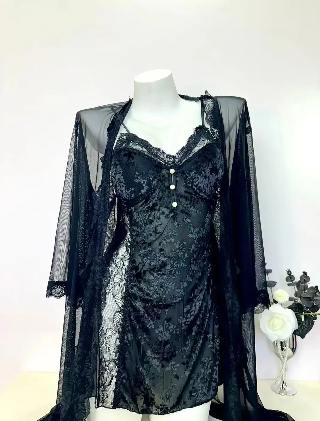 2025 New Balck Lace Patchwork Sling Nightdress Set Women Sexy Mesh Robe Jacquard Flower Home Dressing Gown Women Lingerie