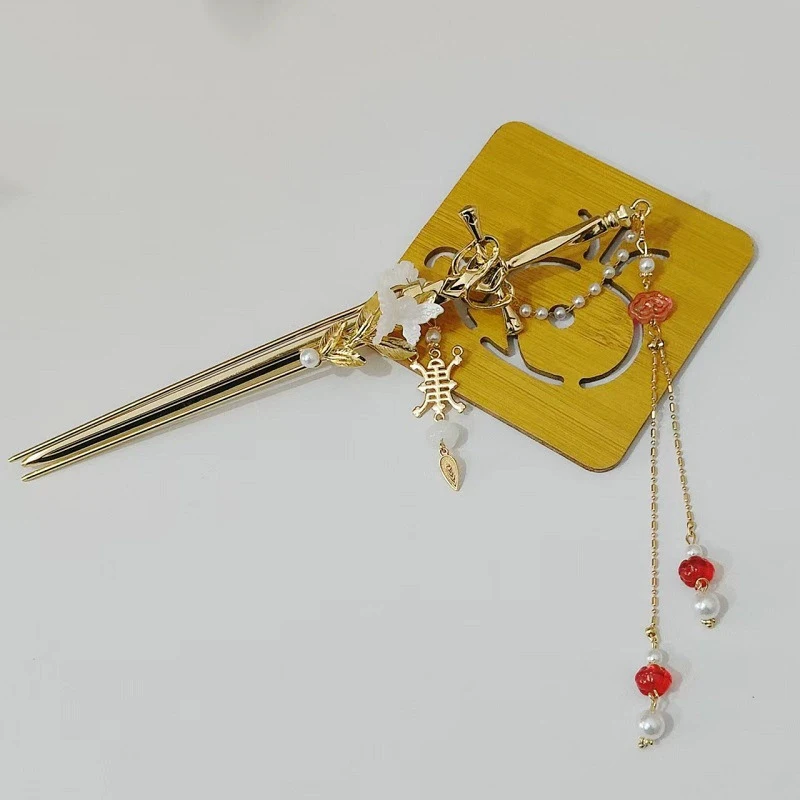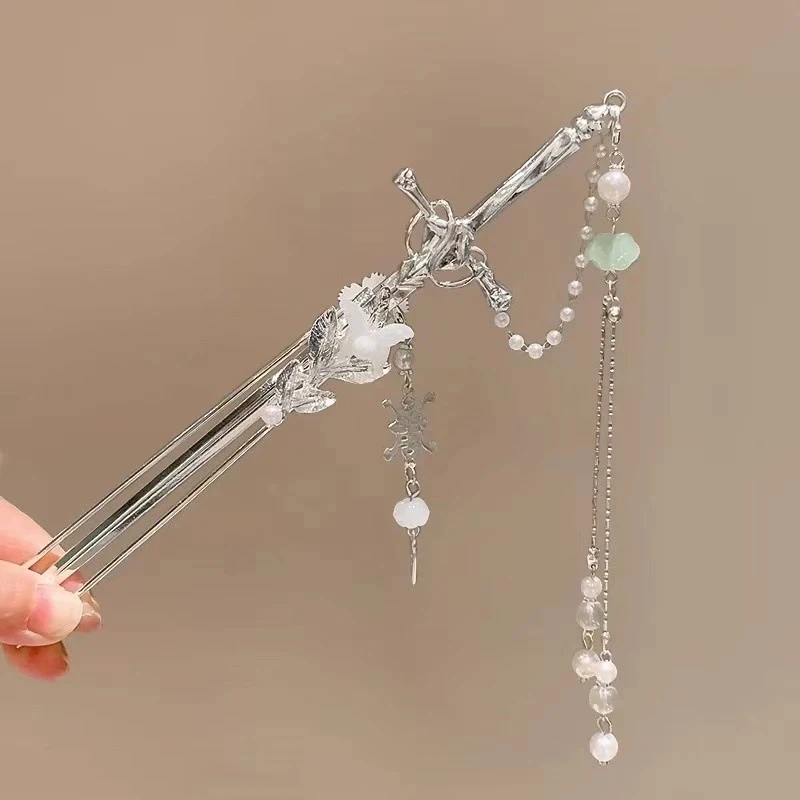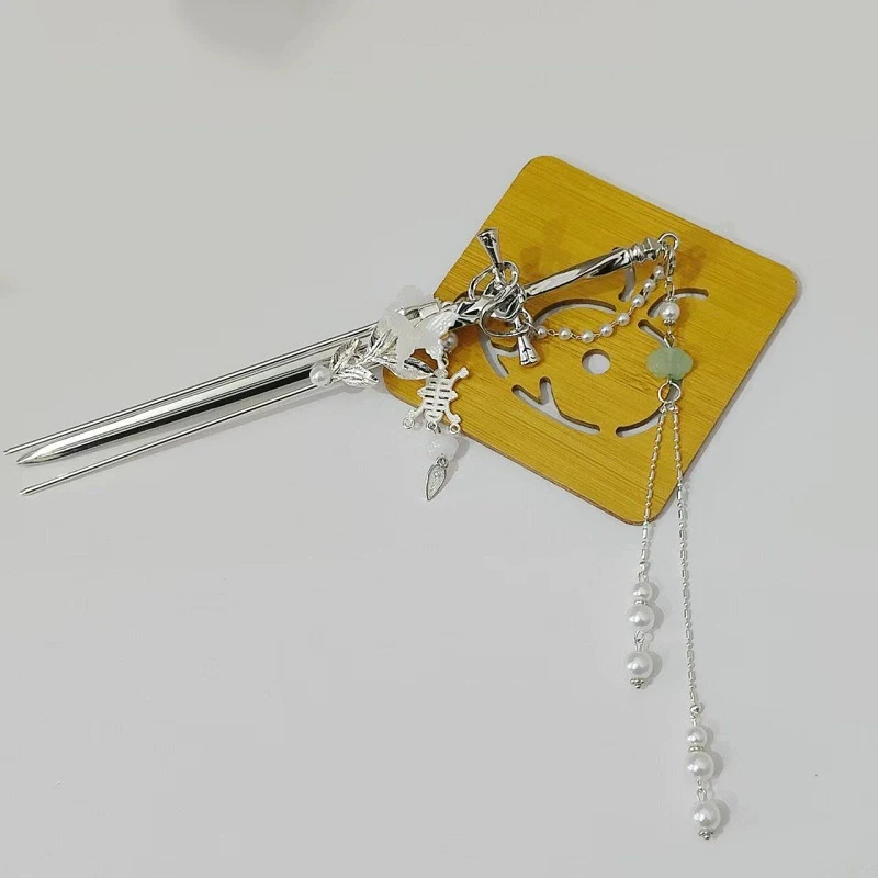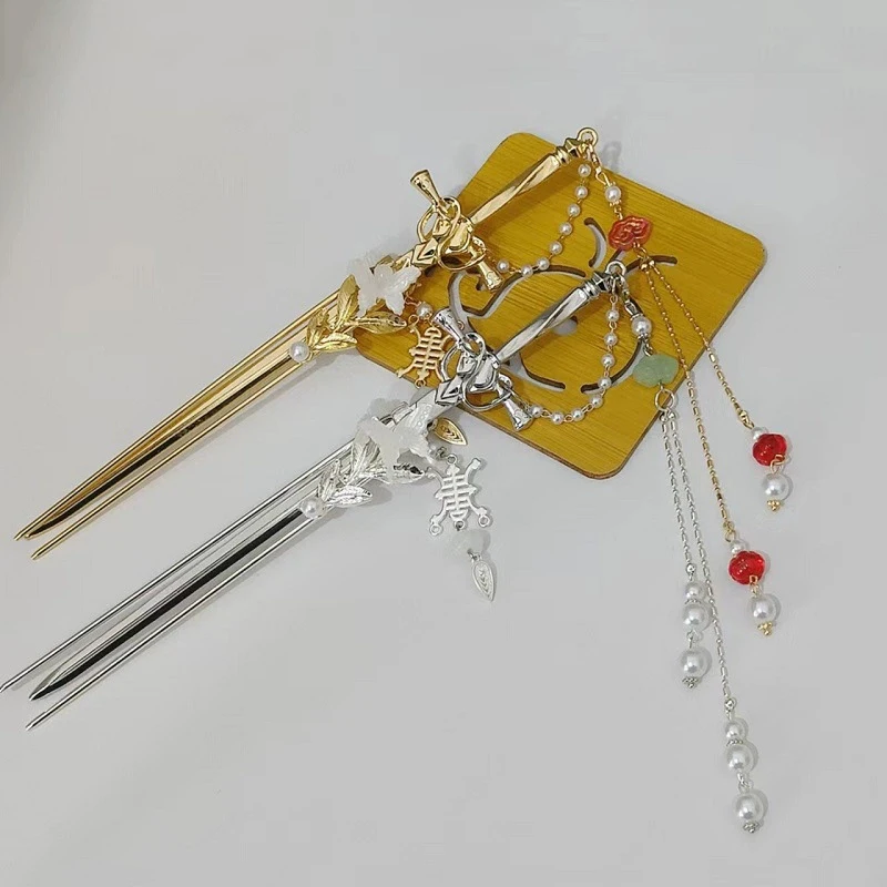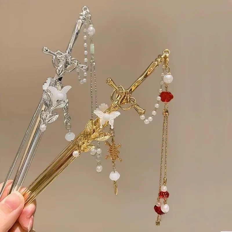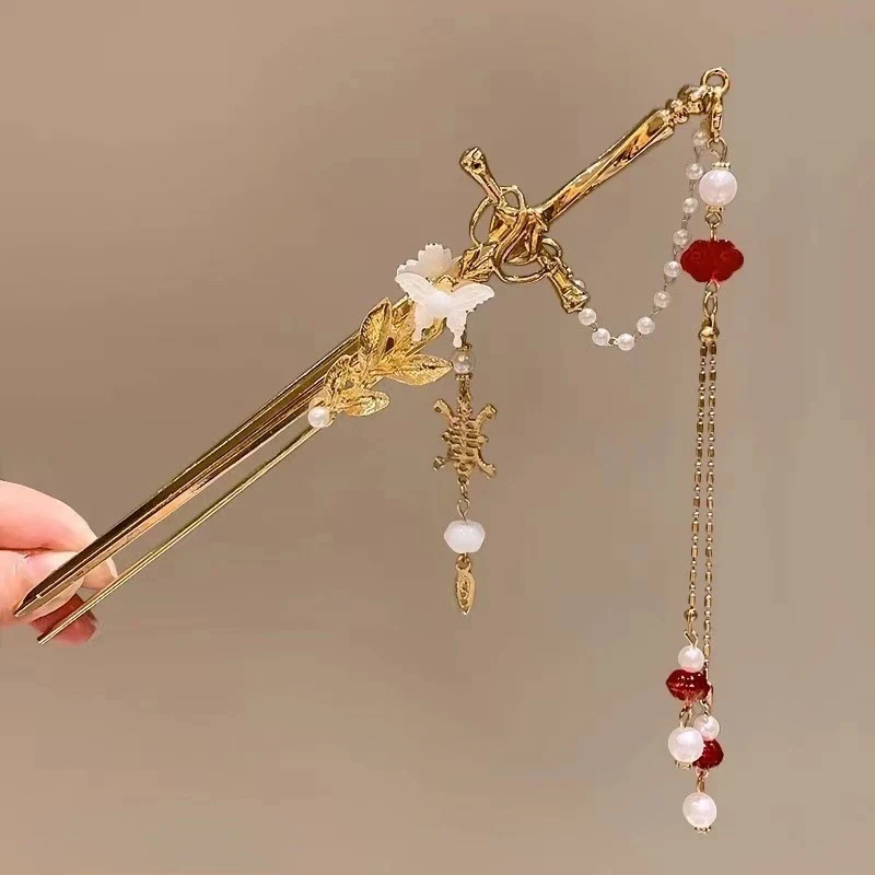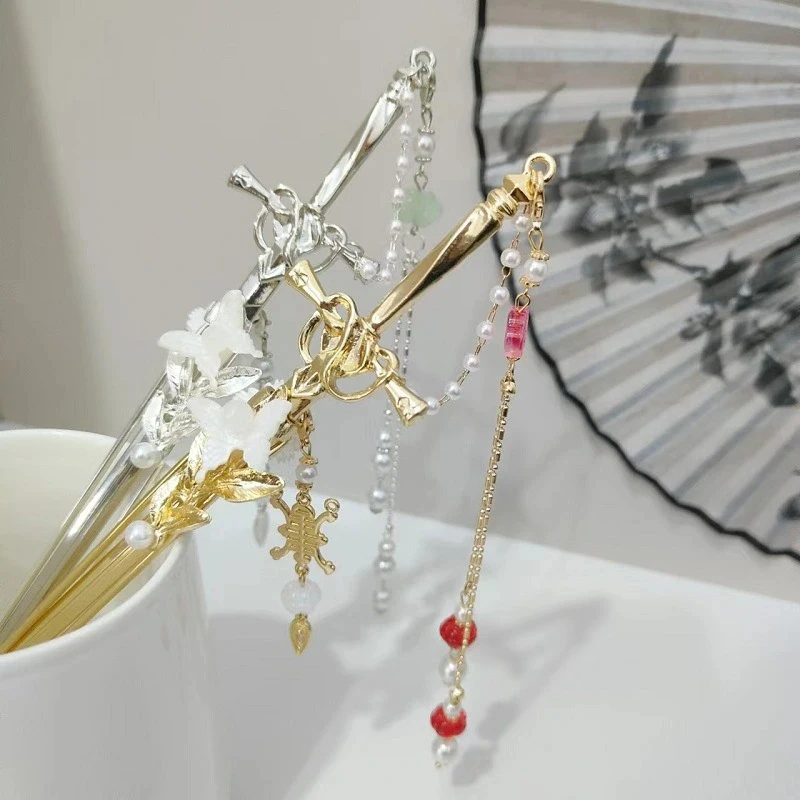 2025 New Chinese Style Sword Hair Sticks for Women Tassel Beads Chignon Pin Pearl Metal Leaves Hairpin Headdress Hair Accessorie