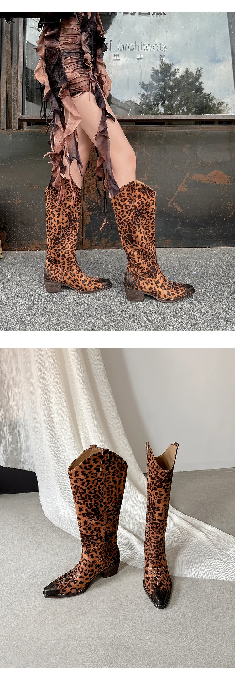 2025 New Retro Knee-Length Women Boots Leopard Print Modern High Heels Fashionable Party Shoes