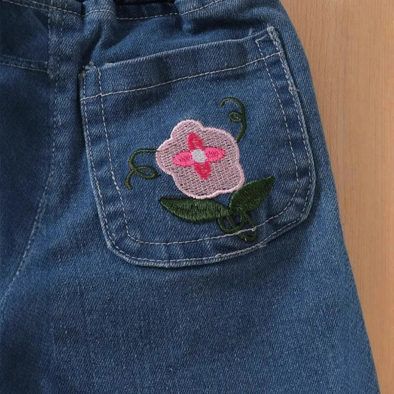 2025 Summer New Mesh Puffy Sleeve T-Shirt + Embroidered Denim Shorts 2 Piece Girl's Set