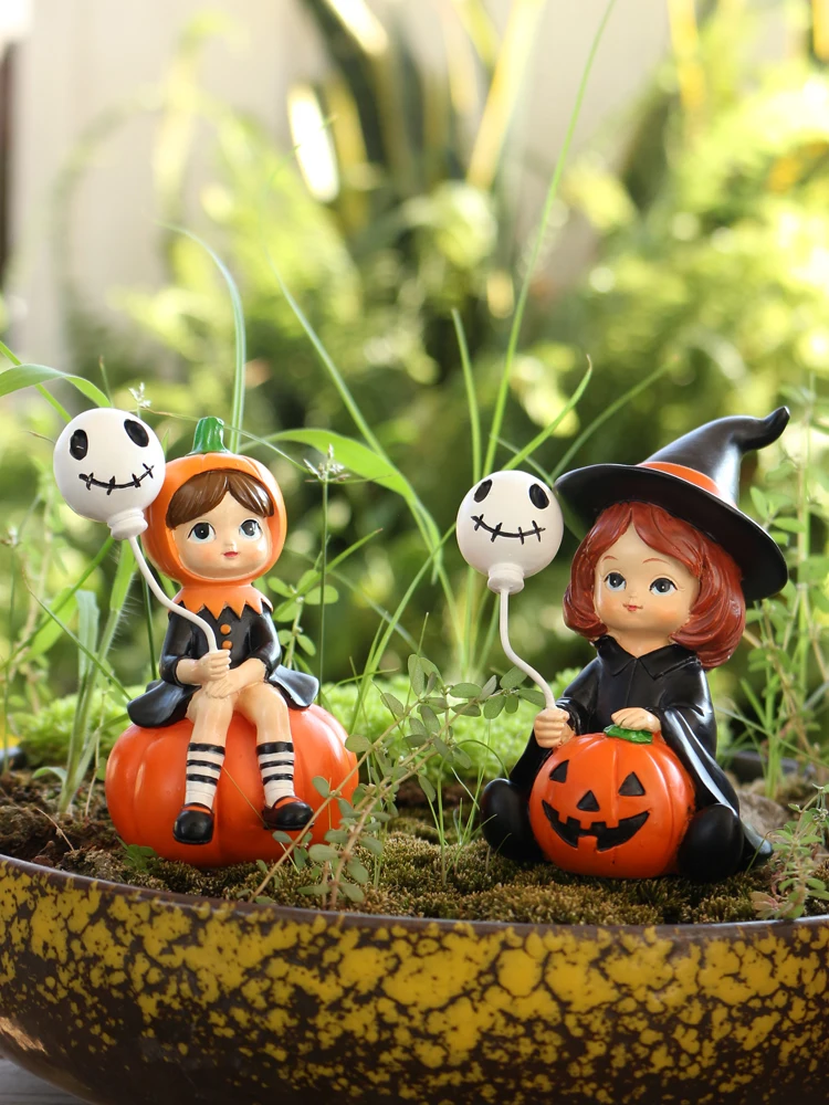 2Pcs Cute Resin Sitting Pumpkin Witch Holding Skeleton Balloon, Halloween Home Desktop Bookcase Halloween Decorations, Outdoor Courtyard Lawn Flower Pot Holiday Atmosphere Decoration