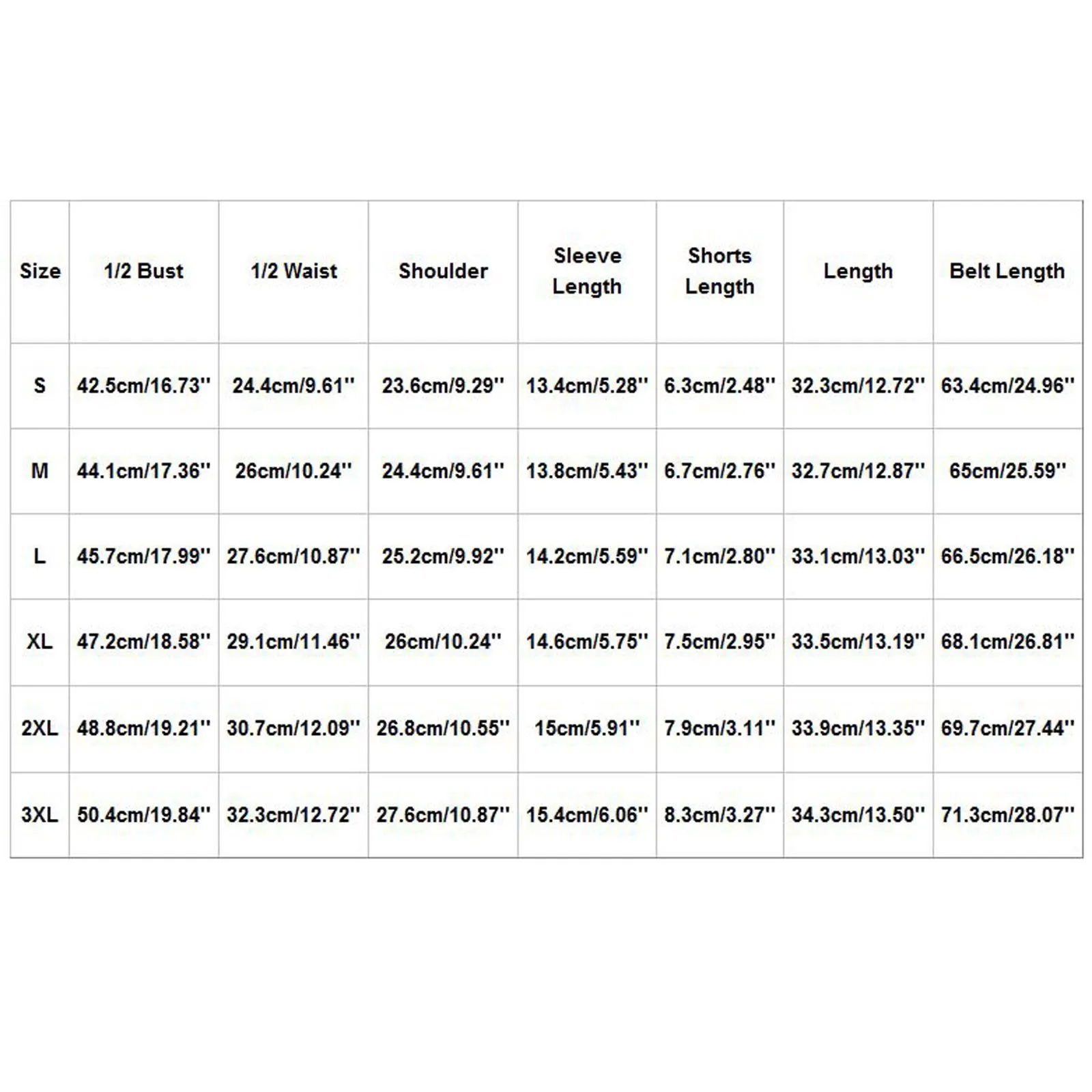 | Size | 1/2 Bust | 1/2 Waist | Shoulder | Sleeve Length | Shorts Length | Length | Belt Length |