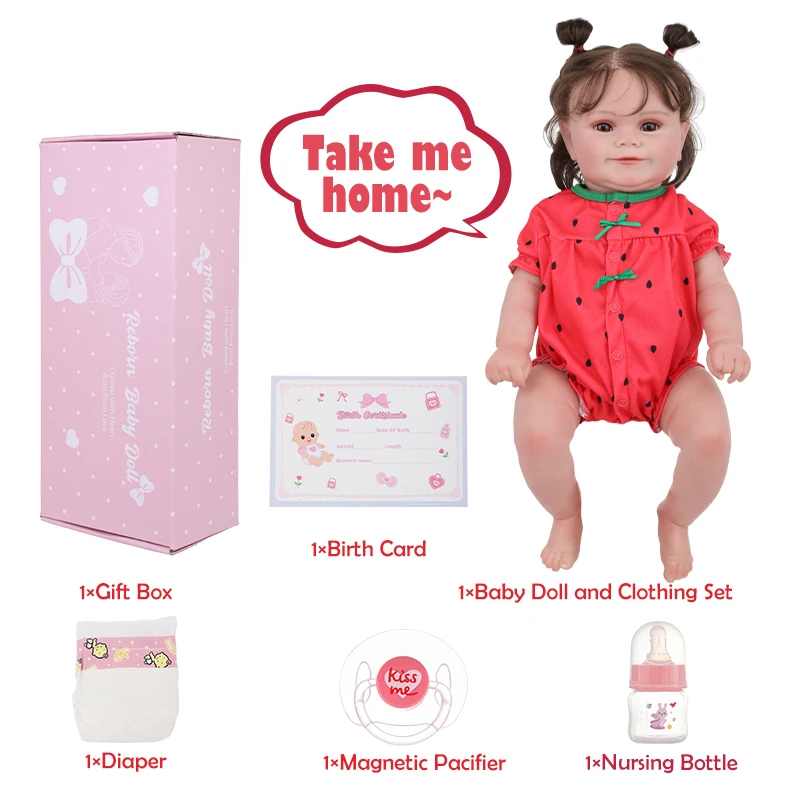 The packaging includes:Doll+clothes set+diaper+pacifier+baby bottle+package box+birth card
