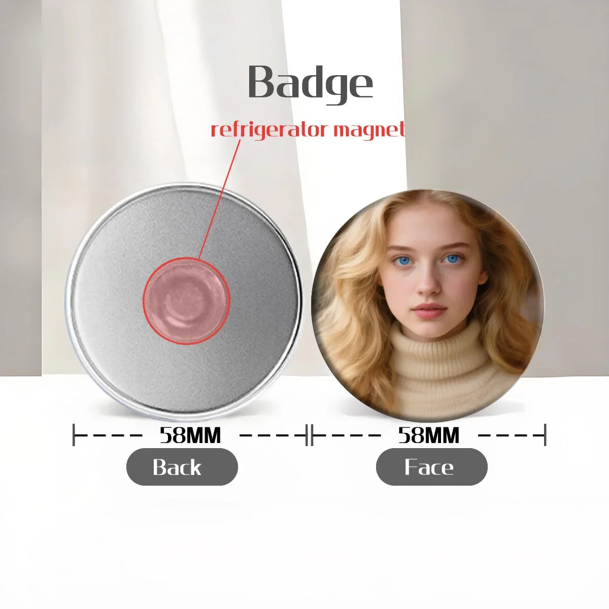 58mm Sparkling Pink Hair Girl Collector's Metal Pin Tinplate Badge with Glass Glitter Film Refrigerator Magnet Mirror Keychain