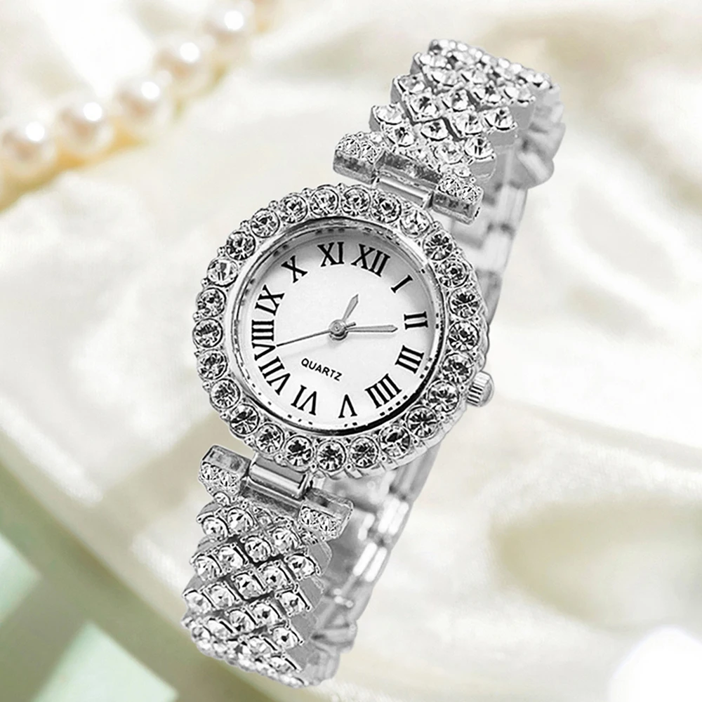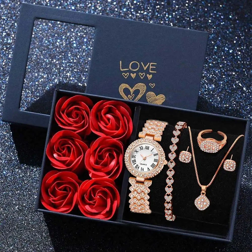 6PCS/SET Luxury Trendy Fashion Roman Digital Scale Quartz Watch Bracelet Necklace Earrings Set Perfect Gift for Friends or Moms
