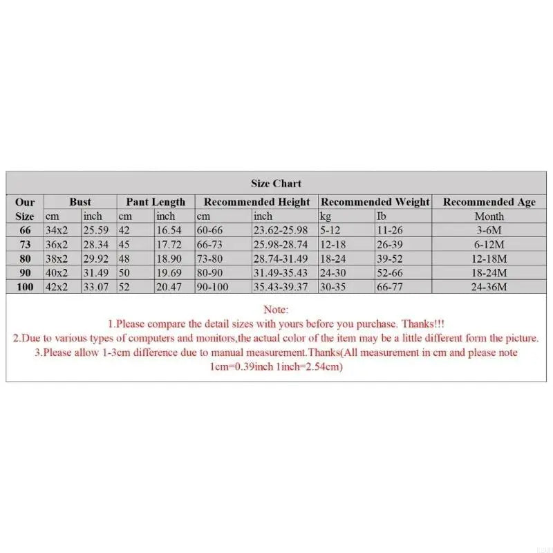 Size 70: Bust: 36x2cm/28.34", Pant Length: 45cm/17.72", Recommended Height: 66-73cm/25.98-28.74", Recommended Weight: 12-18kg/26-39Ib, Recommended Age: 6-12M