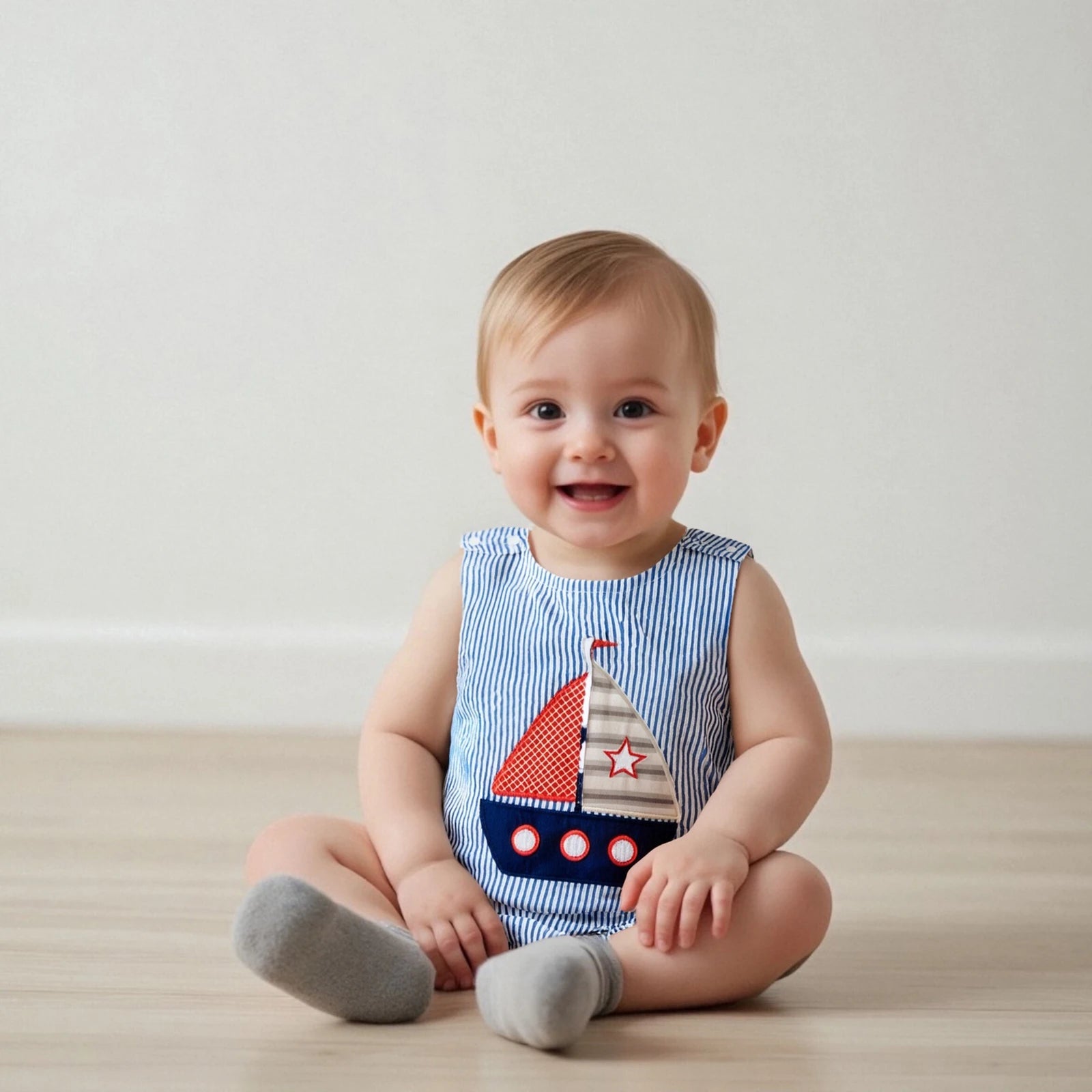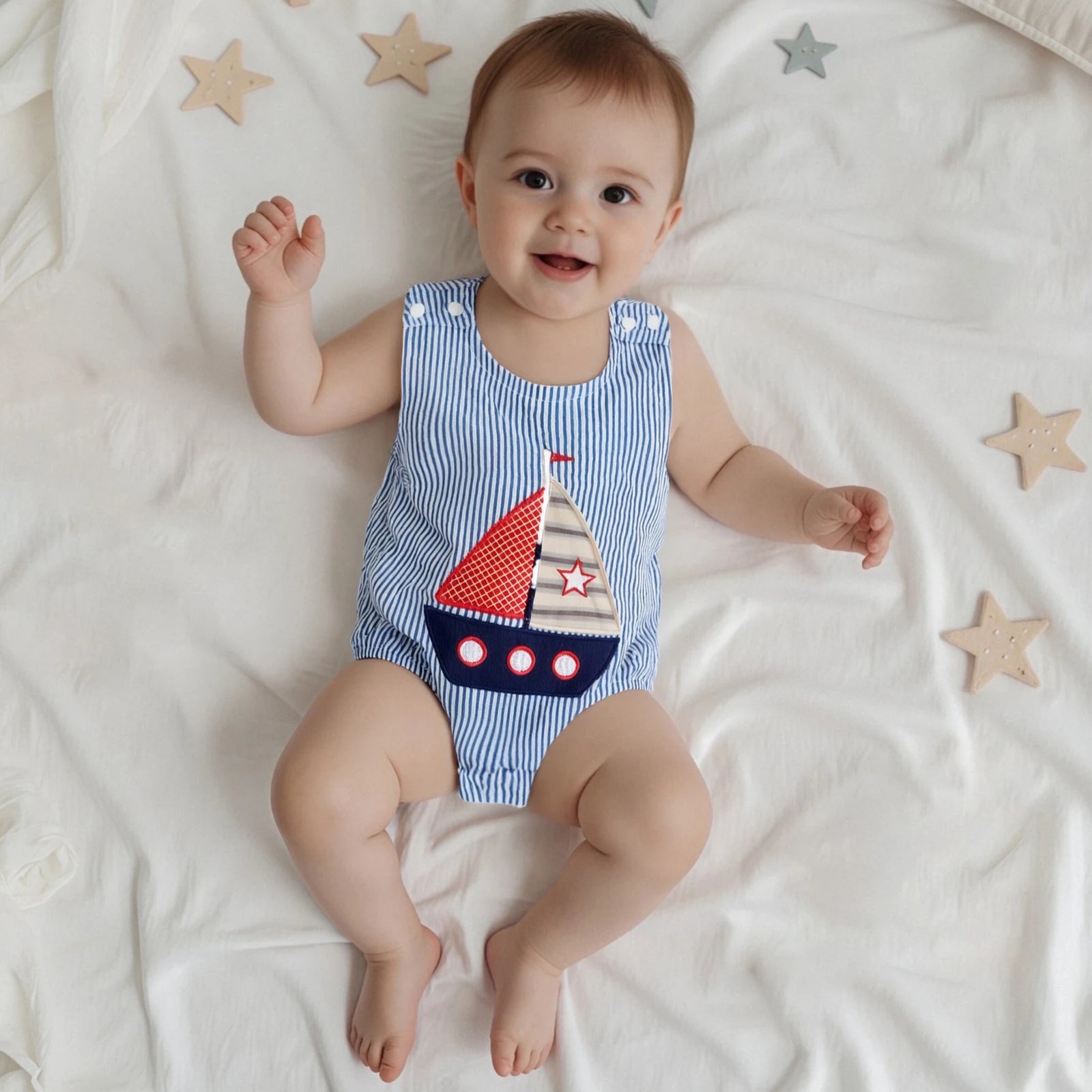 Baby Boy Striped Overalls Romper Sailboat Embroidered Sleeveless Bodysuit Cute Summer Clothes