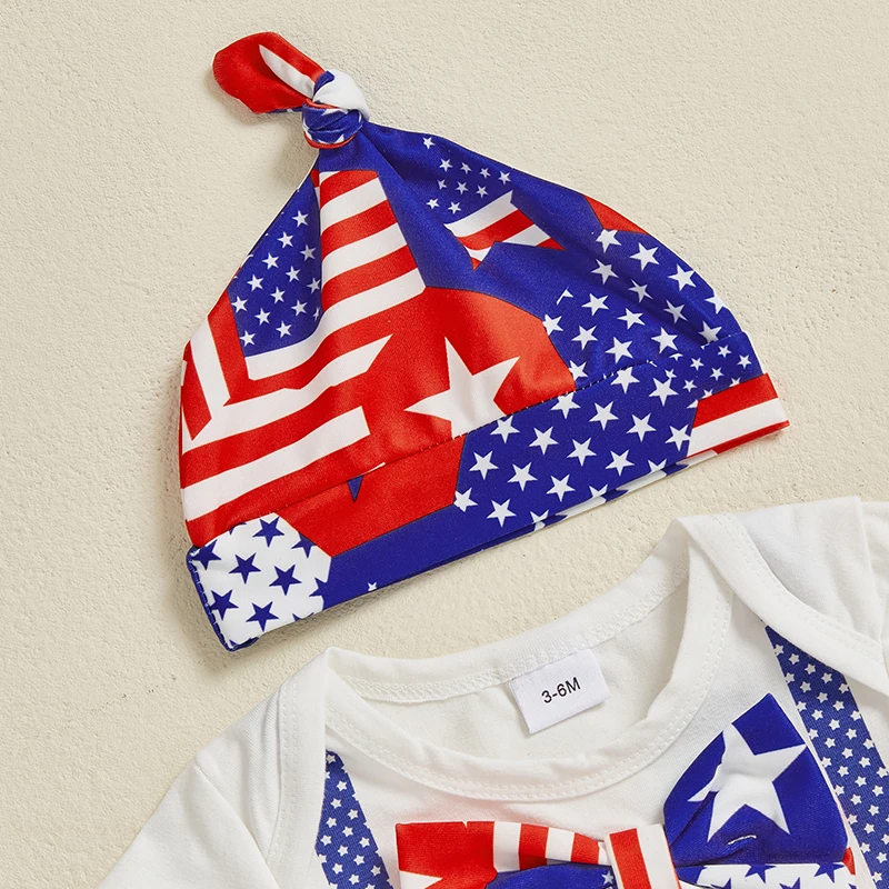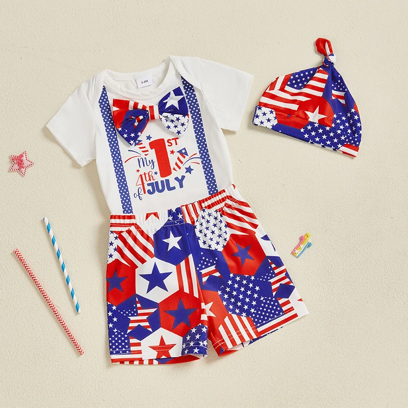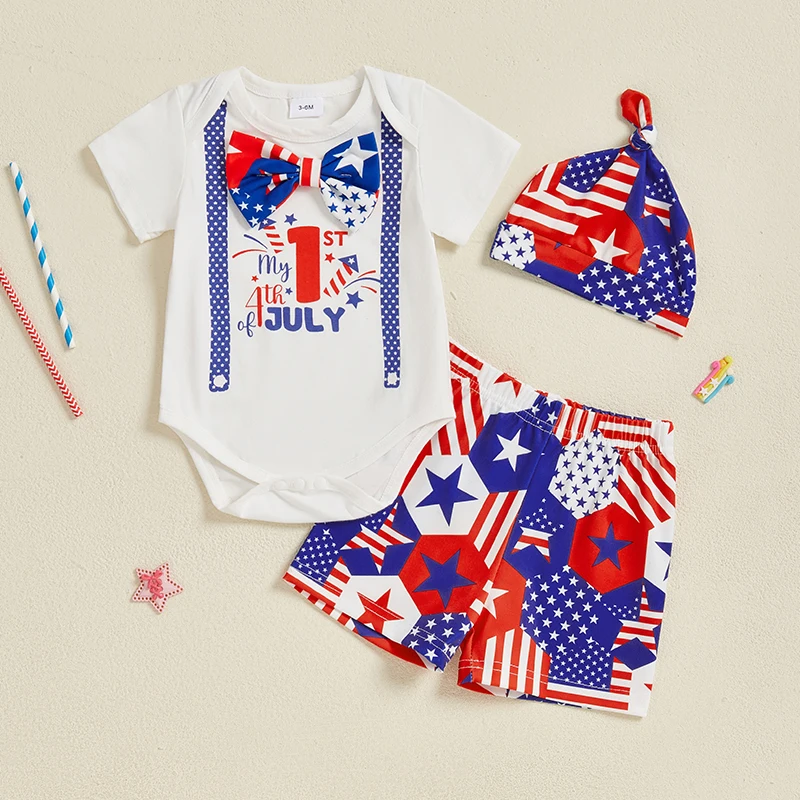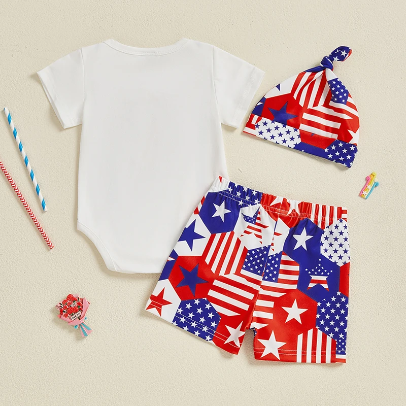 Baby Boys Patriotic Outfit Short Sleeve Jumpsuit and Elastic Star Stripe Shorts and Hat Set 3 Piece Clothes Set