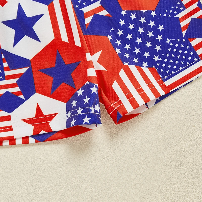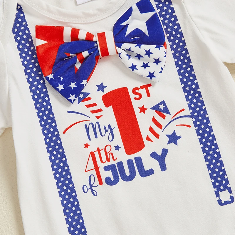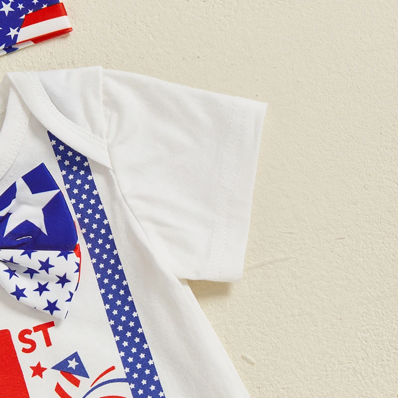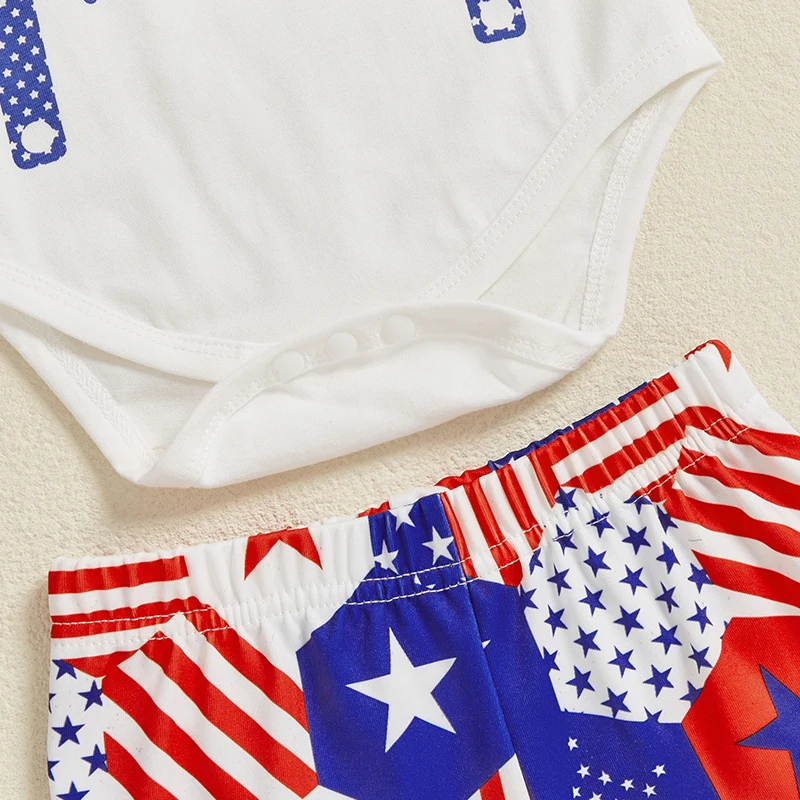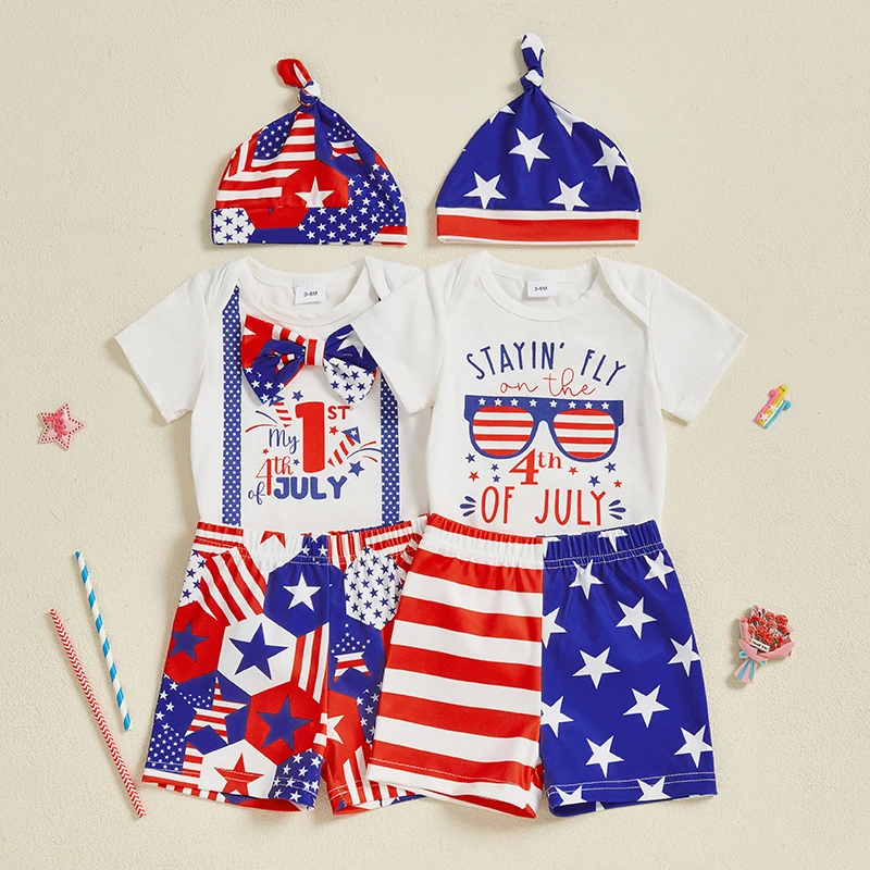 Patriotic baby clothes; Baby boy jumpsuit with letter/glasses print, short sleeves, round neck; Baby boy shorts with star stripe print, elastic waist design to ensure a comfortable fit, and hat set to make your little boy stand out more among his peers