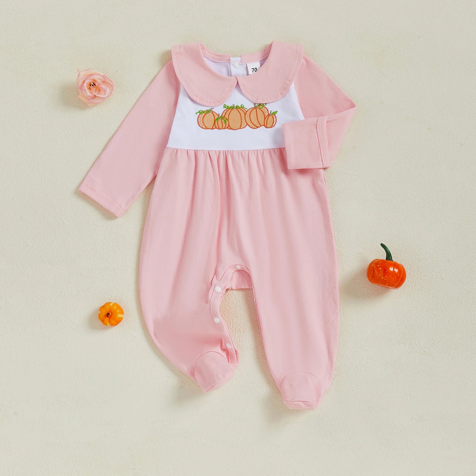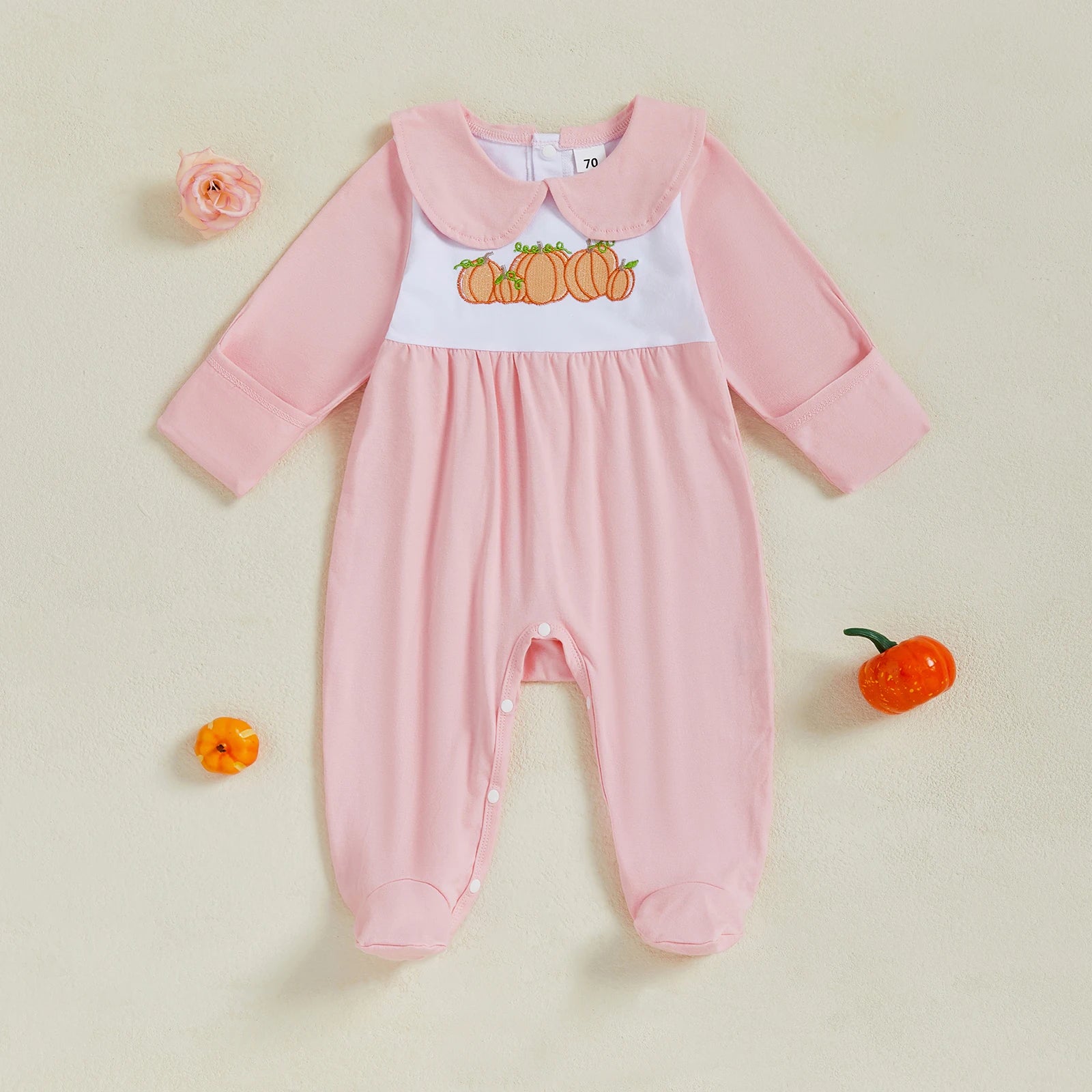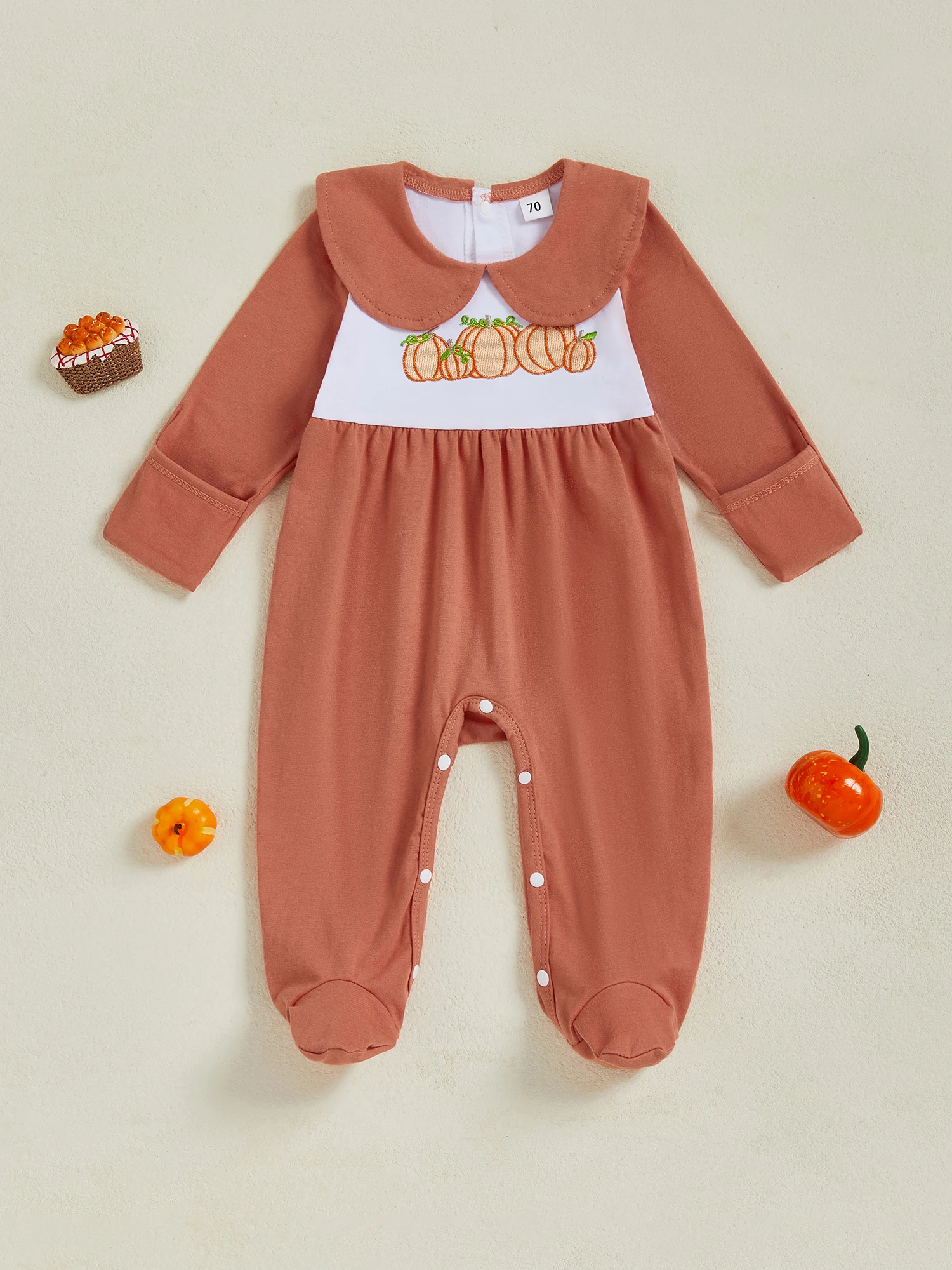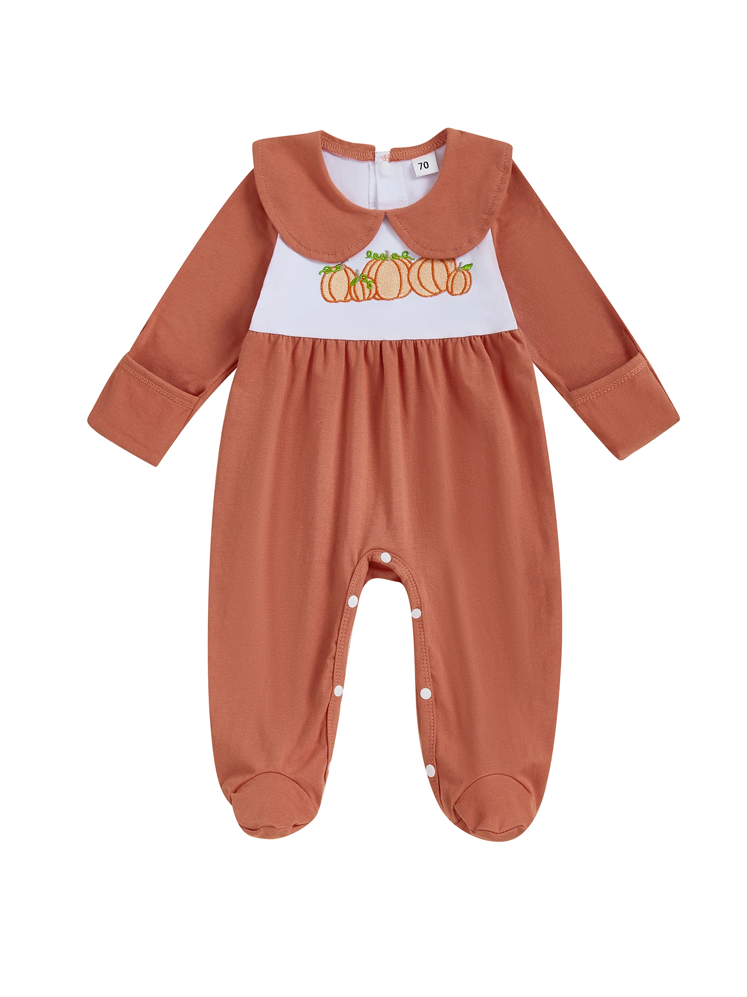 Baby Girl Halloween Romper Pumpkin Embroidered Doll Collar Long Sleeve Footie Pajama Cute Winter Fall Clothes