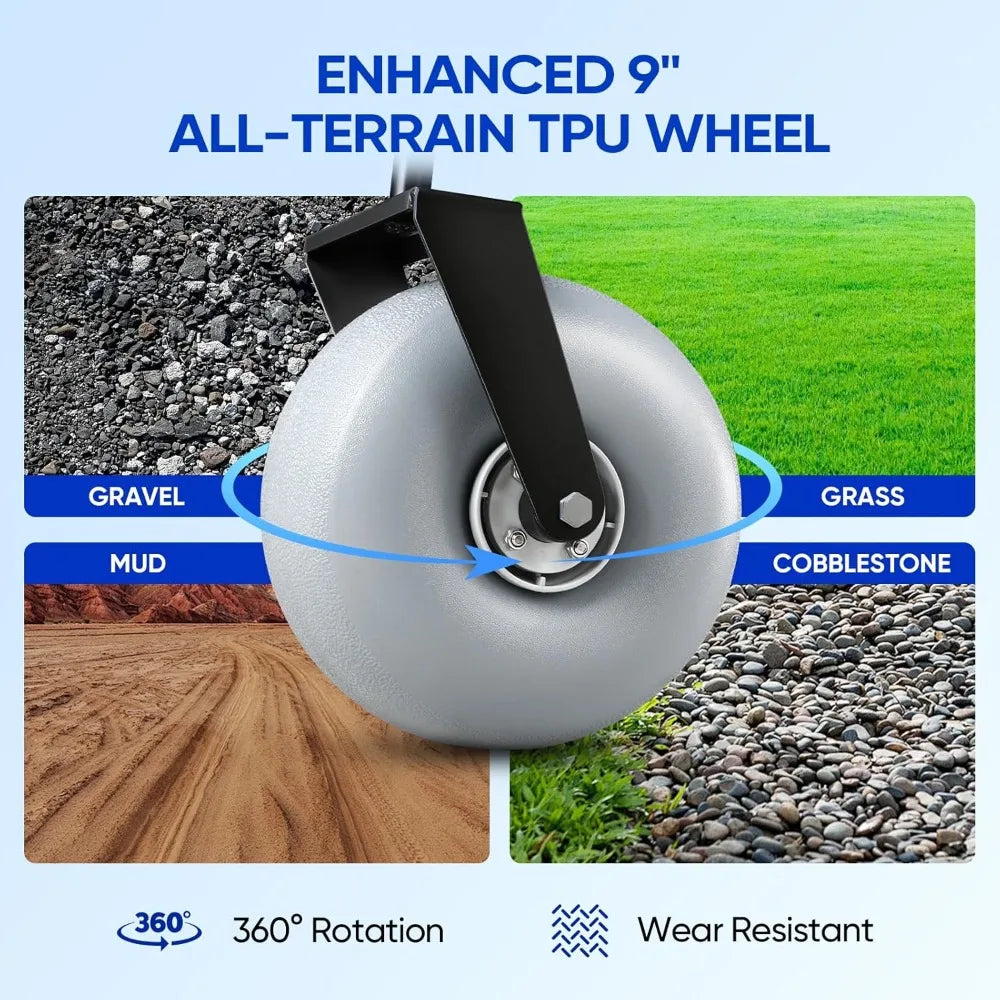 - 9" All-Terrain Balloon Wheels: Equipped with 9-inch all-terrain balloon wheels that rotate 360°, this wagon glides effortlessly over sand, gravel, grass, and other rough surfaces. Includes a portable air pump—inflate the wheels to just 4–5 PSI for optimal performance (no need to overinflate).