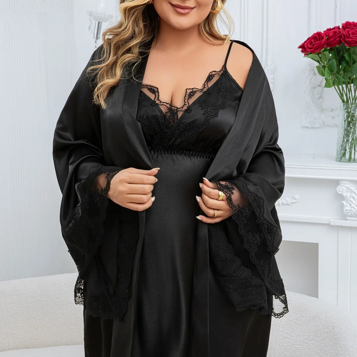 Big Size 3Xl 4Xl 5Xl Robe Set Women Black Lace Trim Sleepwear Satin Lingerie Big Sleeve Kimono Gown Loungewear Nightwear 2Pcs