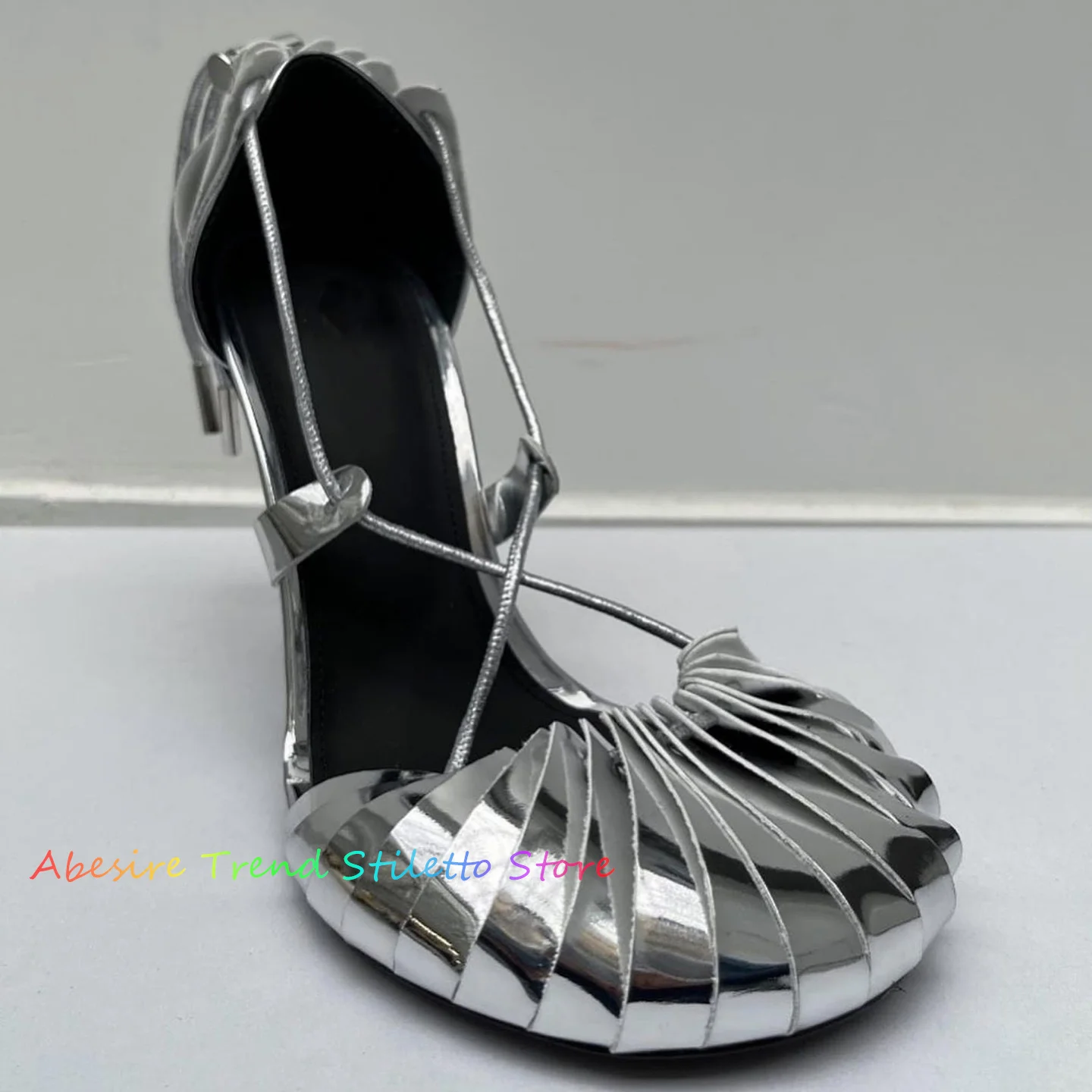 Black Leather High Heel Sandals Women Summer New Round Toe Drawstring Fastening Stiletto Heel Lace Up Party Dress Shoes