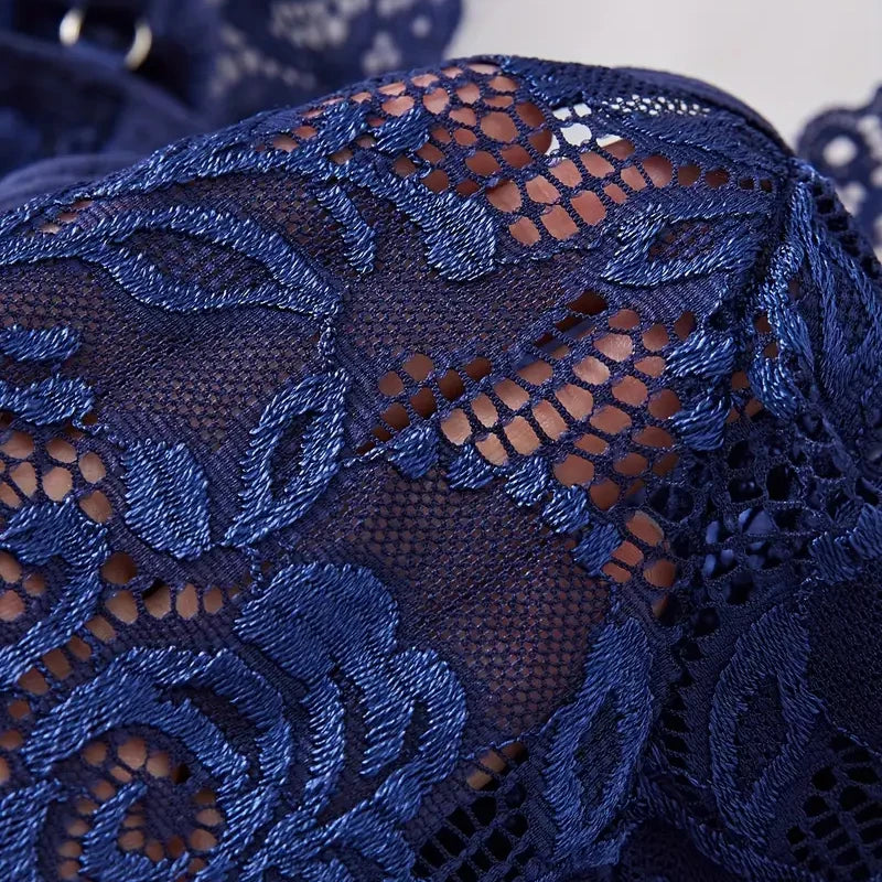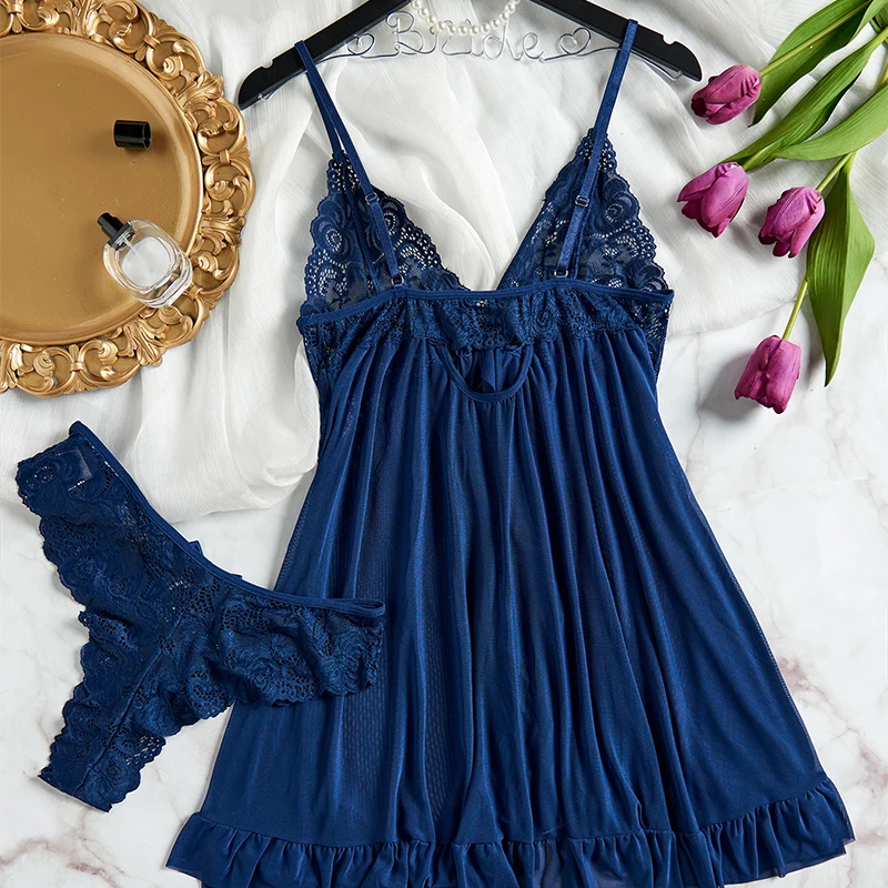 Blue Lace Transparent Deep V Bra Pajamas Sexy Lingerie For Women Babydolls Dress Sleepwear Set Erotic Underwear Exotic Costumes