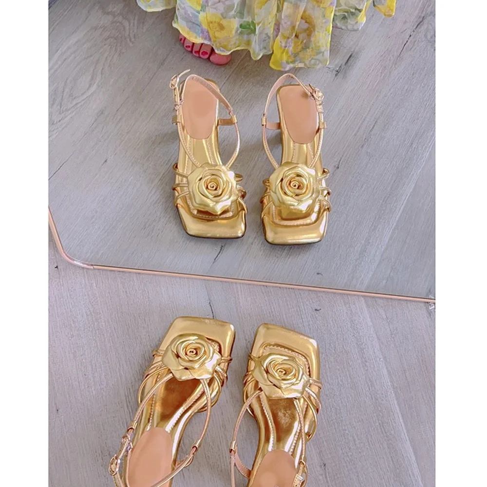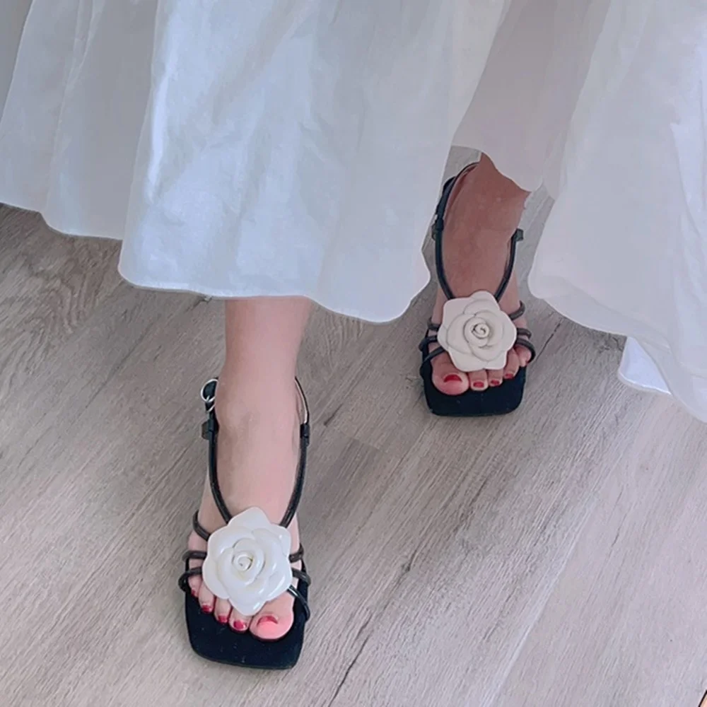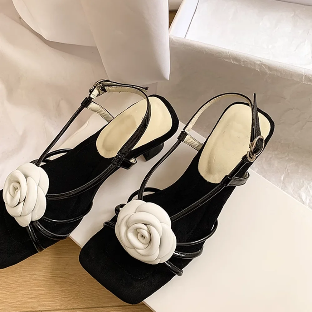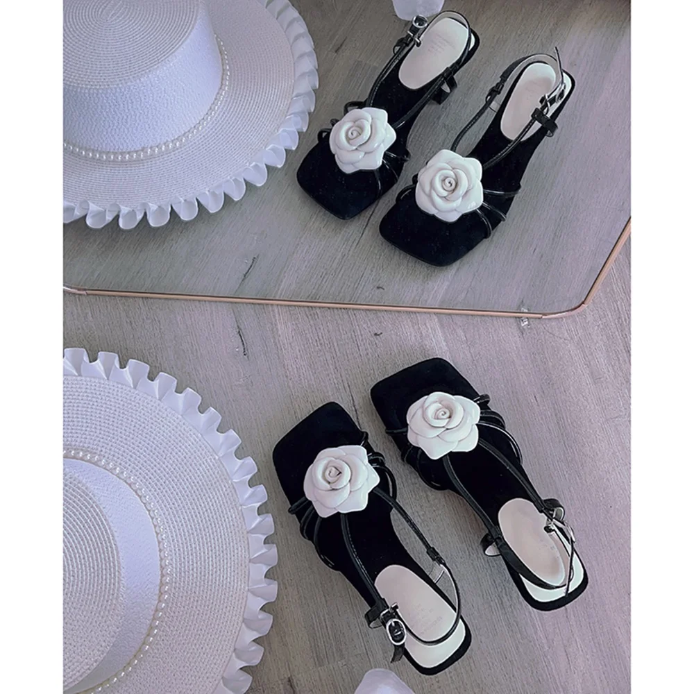 Camllia Decoration Cross Tied Sandals Sexy Square Toe Thin Heel Slingback Ankle Warp New Arrivals Fashion Womne Modern Shoes