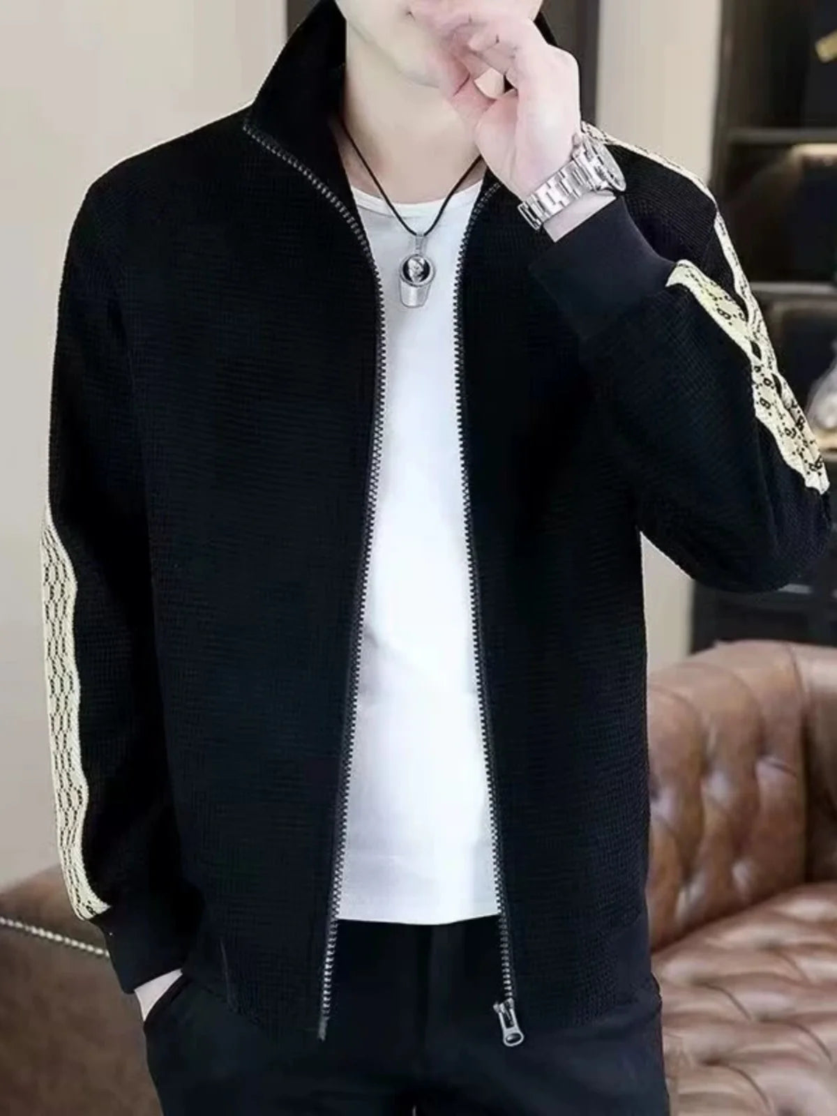 This men's jacket features a trendy waffle pattern and collar design, making it a stylish addition to any wardrobe.