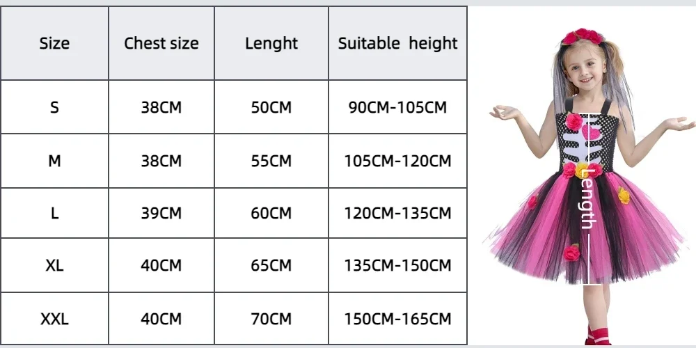 XXL size: Chest circumference is 40CM, skirt length is 70CM, suitable for children between 150CM and 165CM in height.