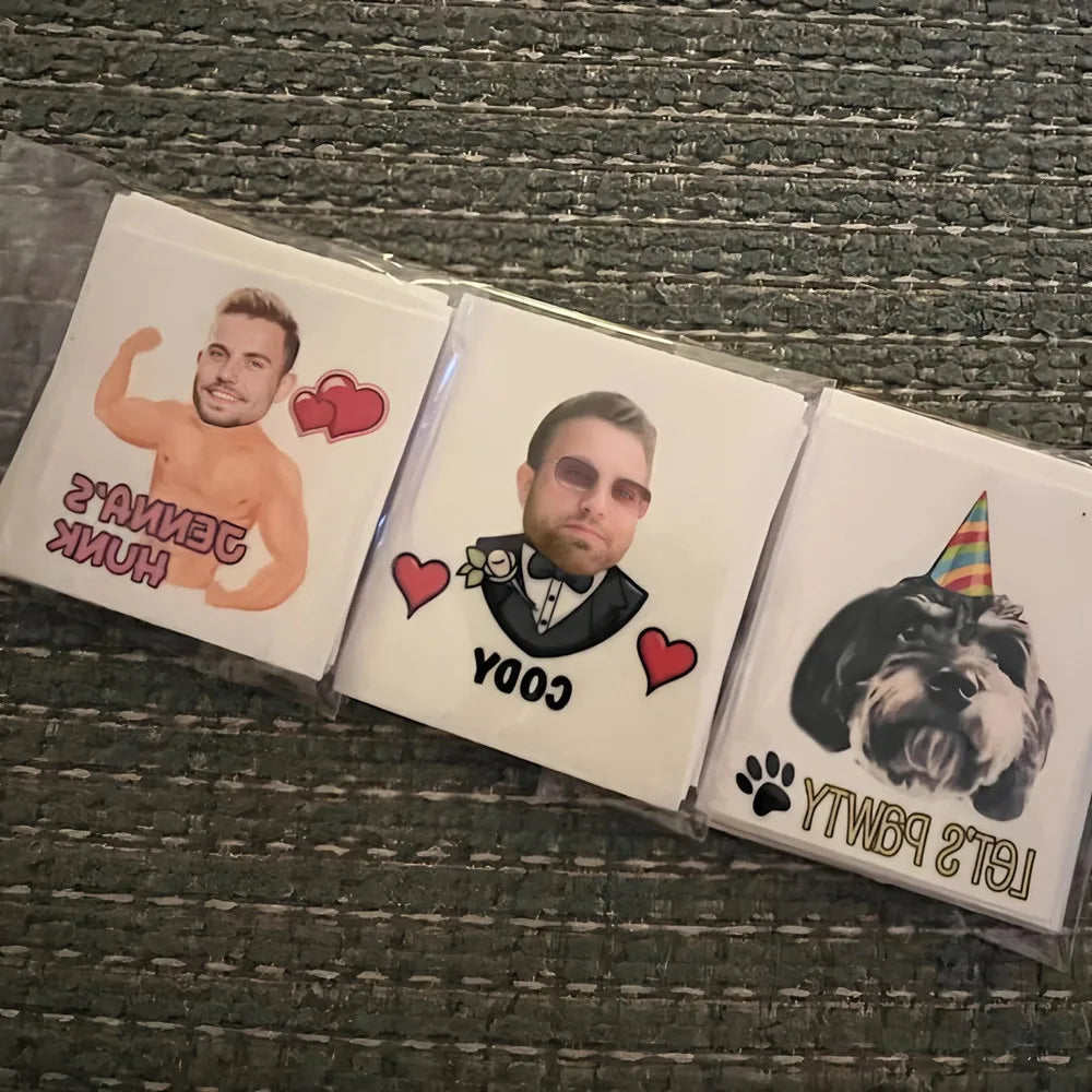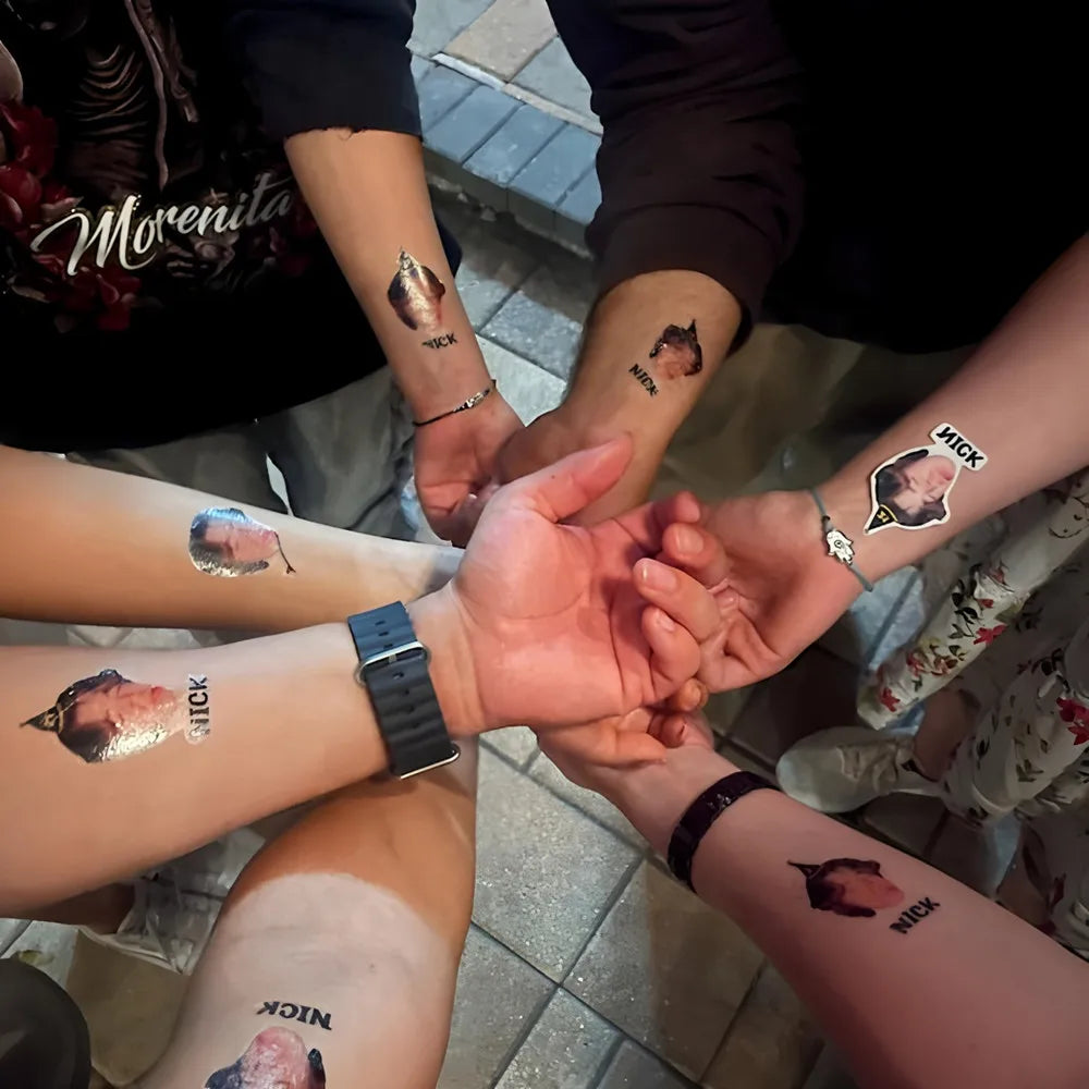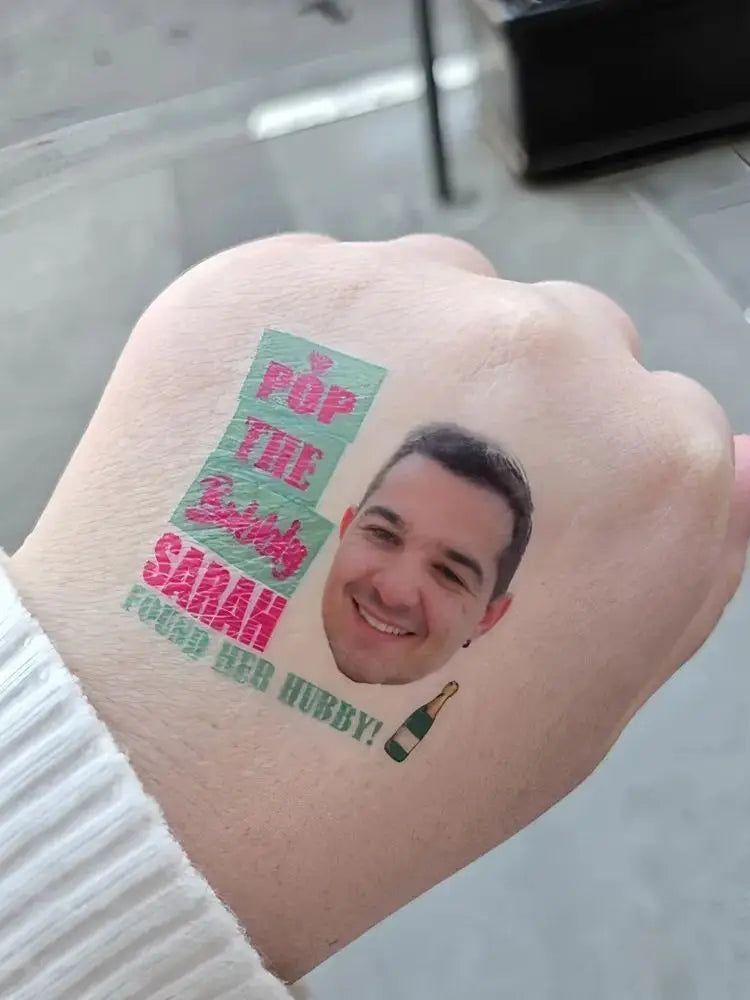 Our temporary tattoos are personalised with a face to give a personal touch for your party. A great hit and a fun way to celebrate any joyous occasion! Give your guests a great laugh while celebrating! They are sure to dazzle and delight whether you're planning a birthday party, bachelorette hens party, girl's trip, graduation bash, Halloween, Christmas, Valentine's day, cosplay, etc. Send us your photo and we will transform it into tattoos for you!