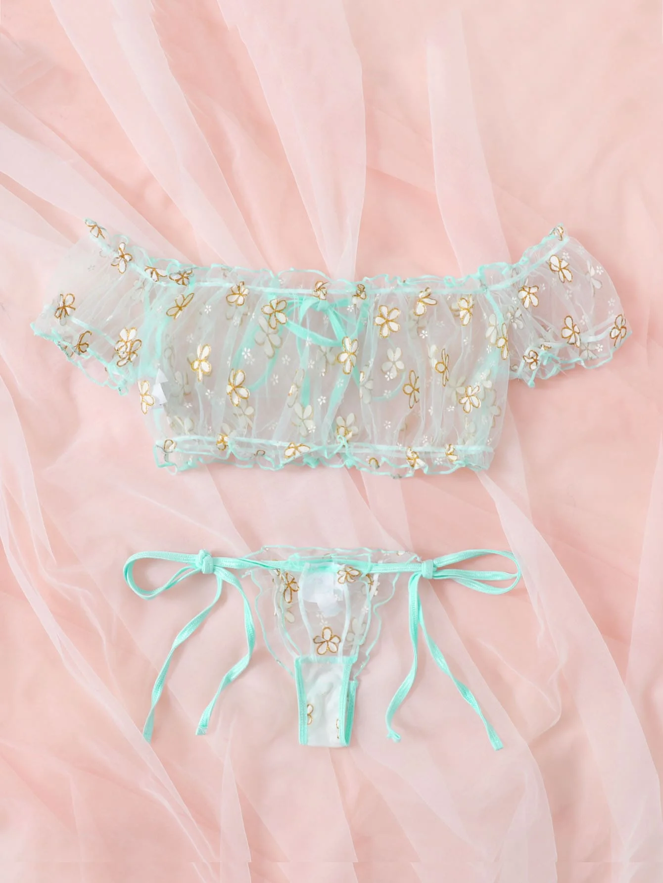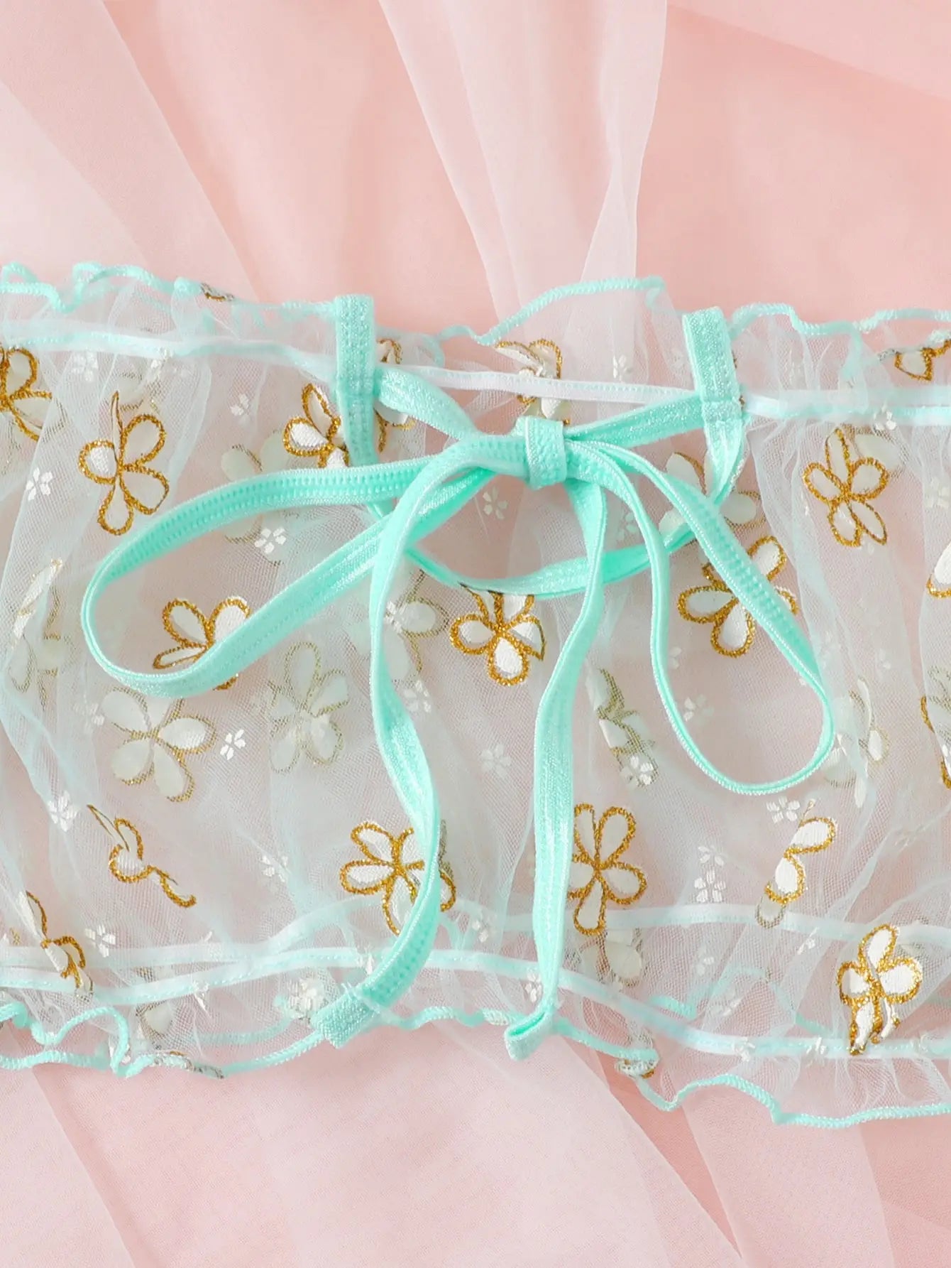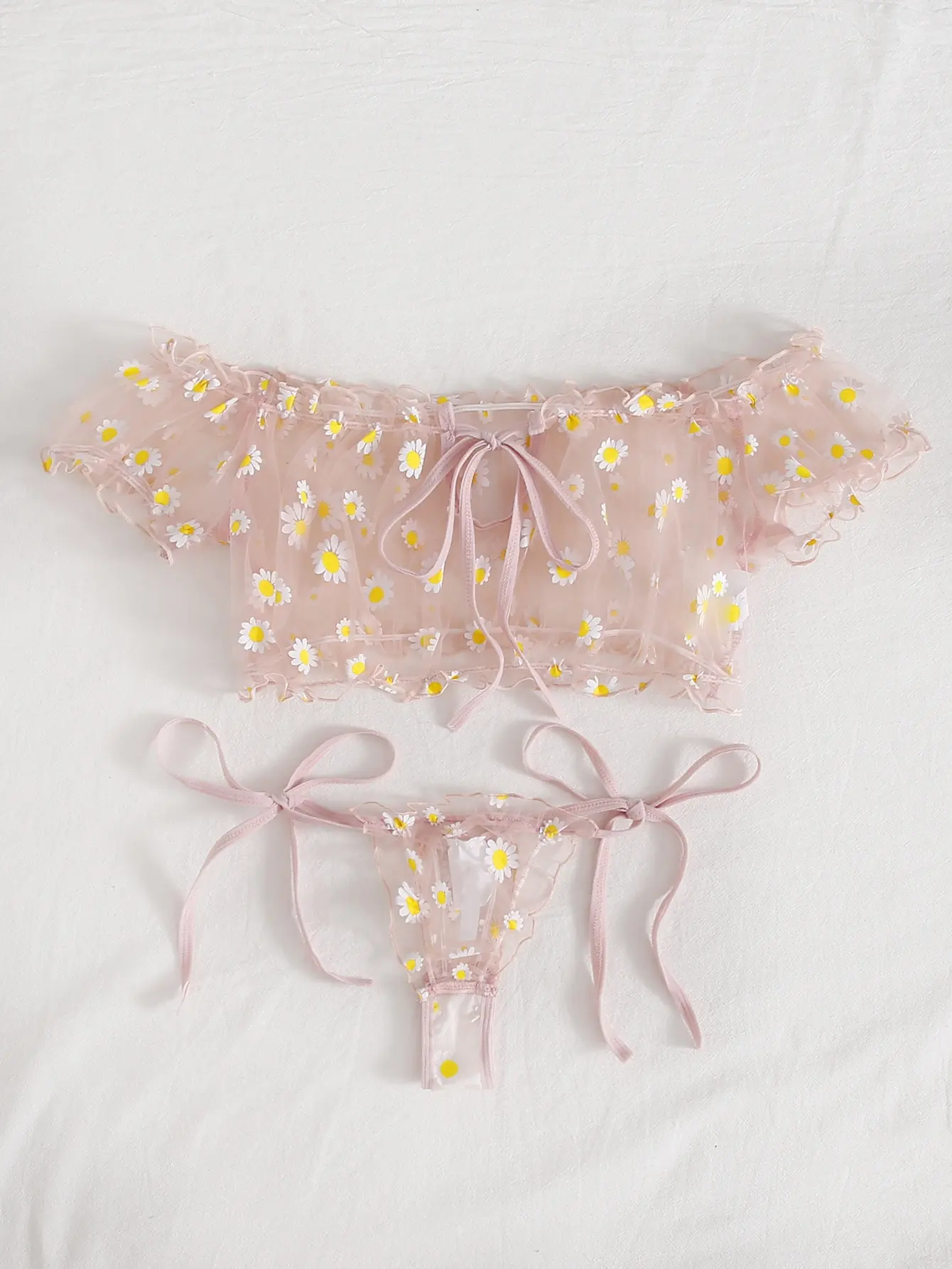 Delicate And Pretty Lace-up Traf And Thong Pajama Set Sexy Sleepwear Babydoll Nightdress Short Sleeve Floral Lingerie Underwear