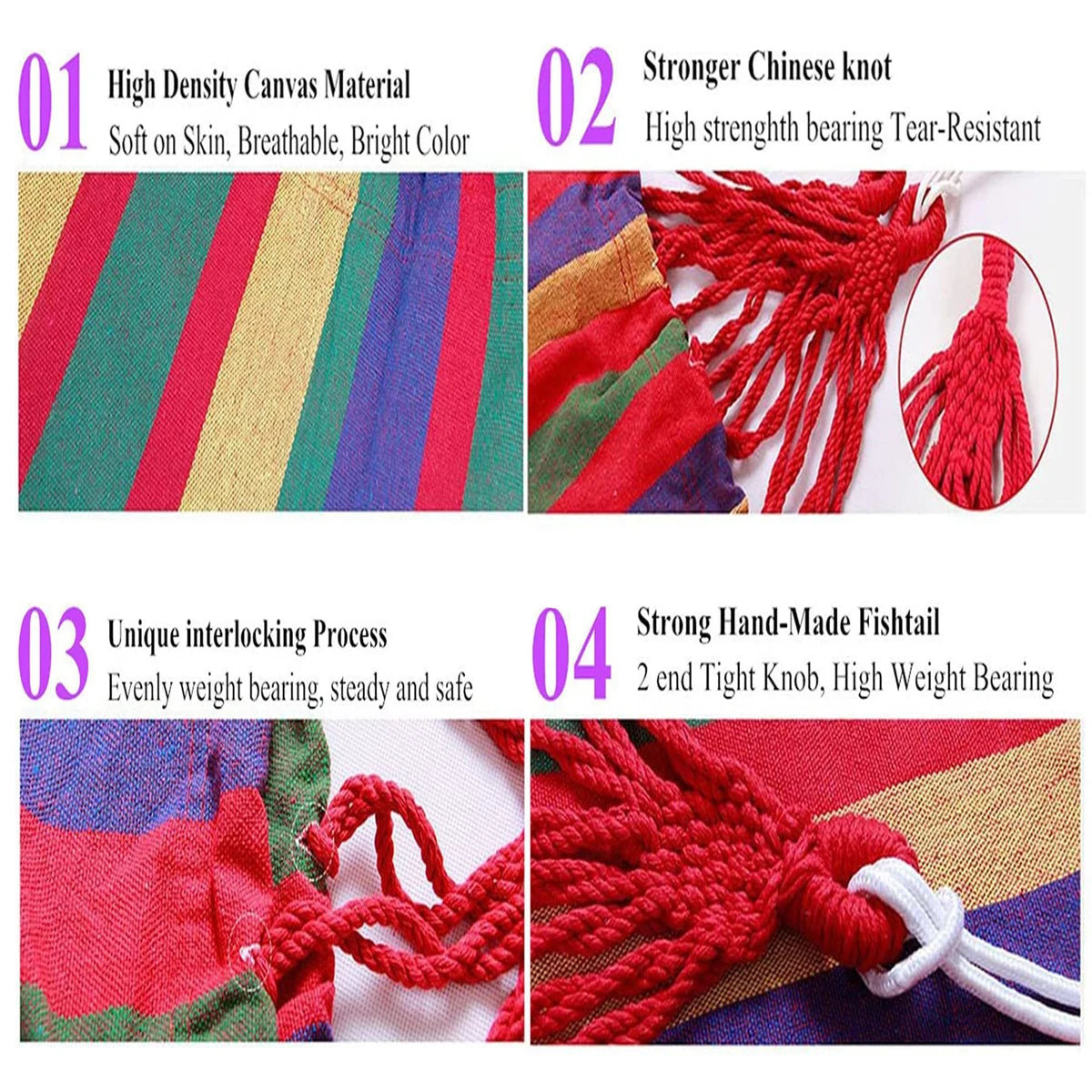 The double hammock is made of high-density cotton fabric. Cotton hammock is comfortable and safe, breathable and sweat-absorbent, strong and durable, this camping hammock can hold up to 450 lbs.