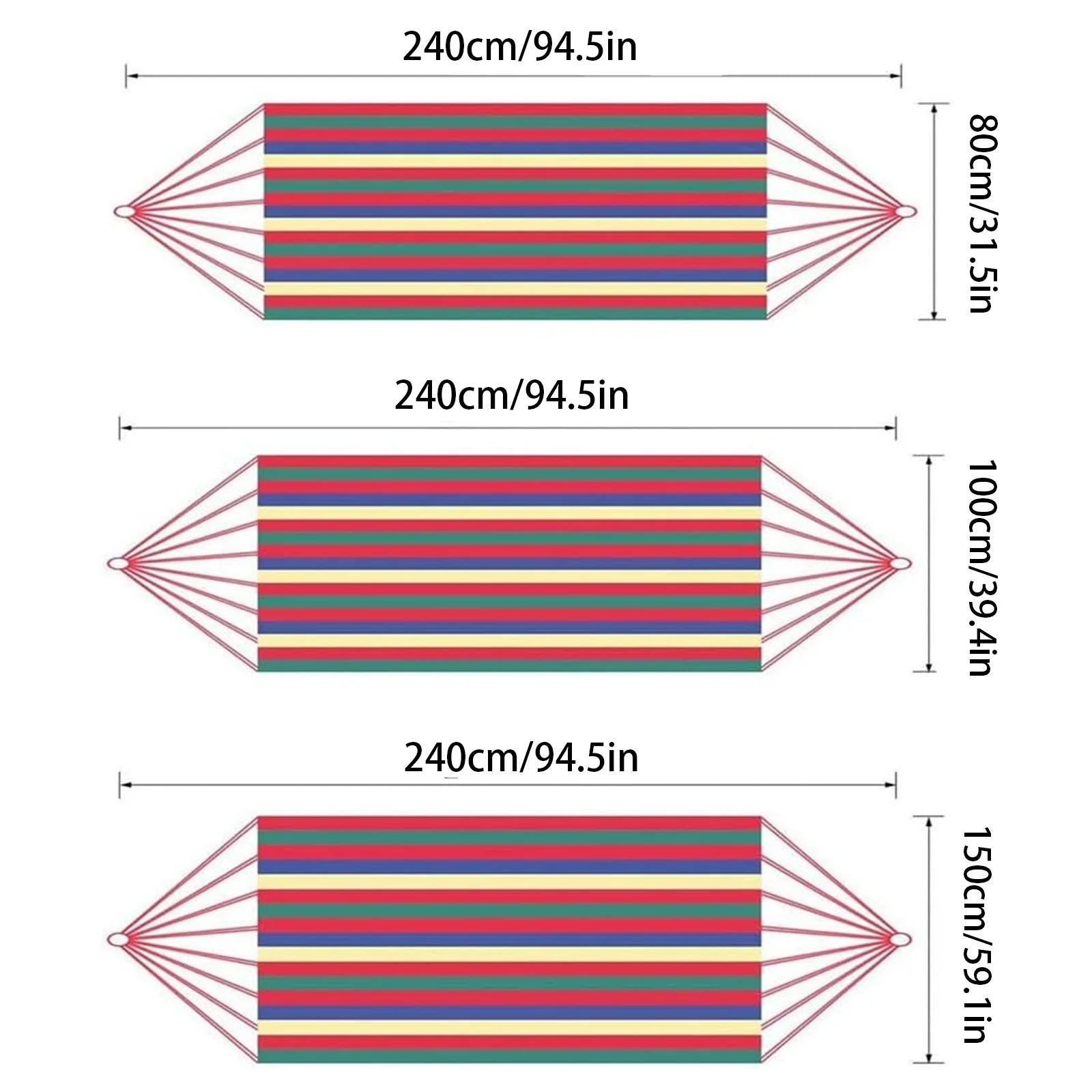 The sizes of this outdoor hammock are: 240cmX80cm, 240cmX100cm, 240cmX150cm, available in blue and red; this double hammock can accommodate 2 people. You can share relaxation with your friends or family.