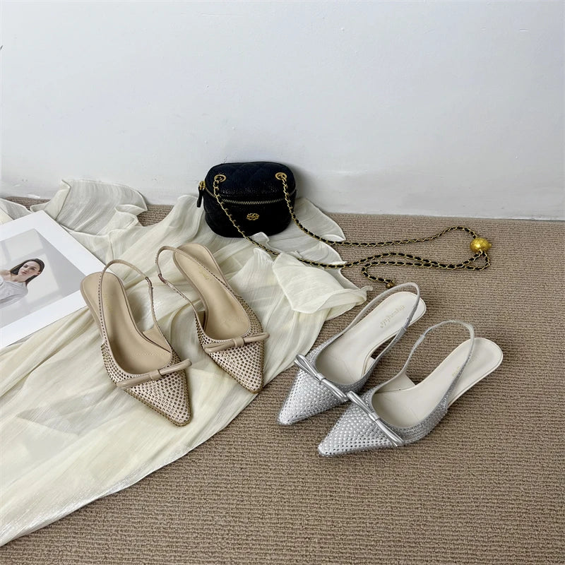 Eilyken Designer Silk CRYSTAL Pumps Women Sexy Pointed Toe Low Thin Heels Wedding Banquet Dress Mule Elegant Ladies Shoes