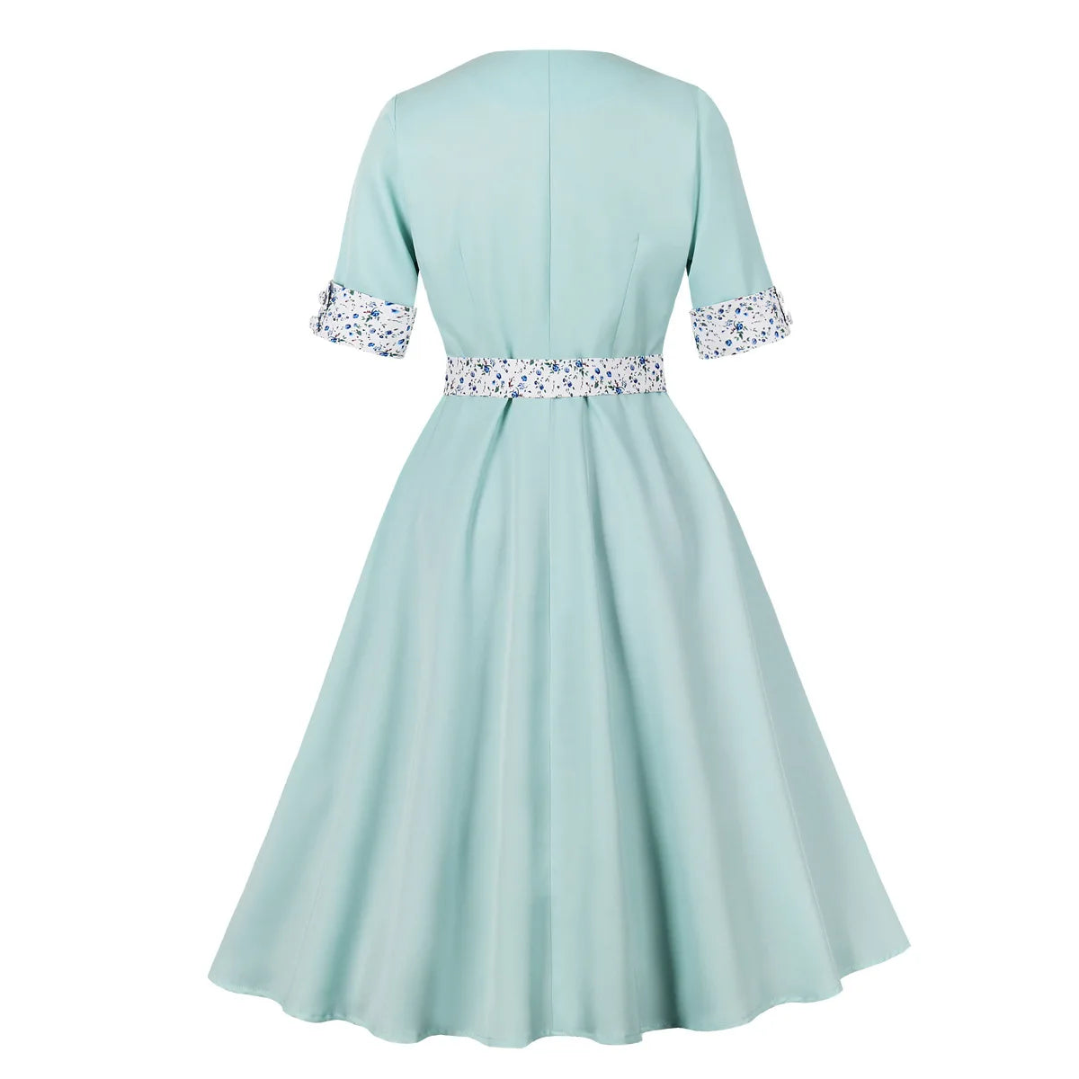 Elegant Fashion American Women Floral Patchwork Short Sleeved Lapel Gentle Afternoon Tea Appointment Belt Casual Commuting Dress