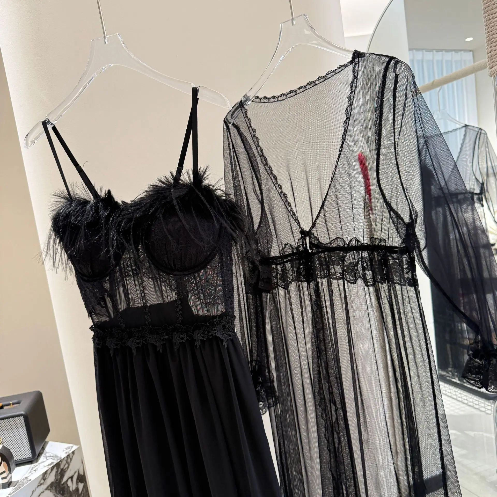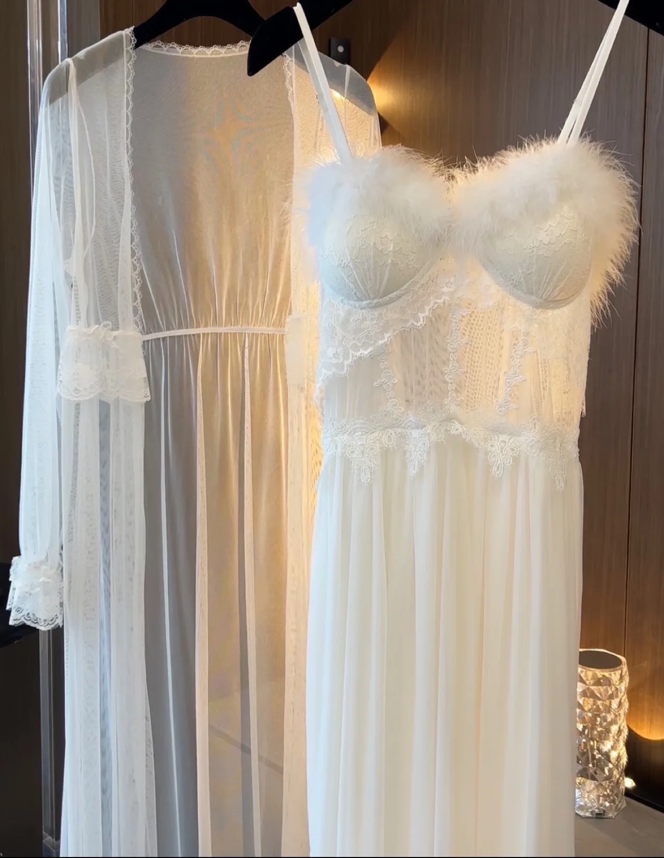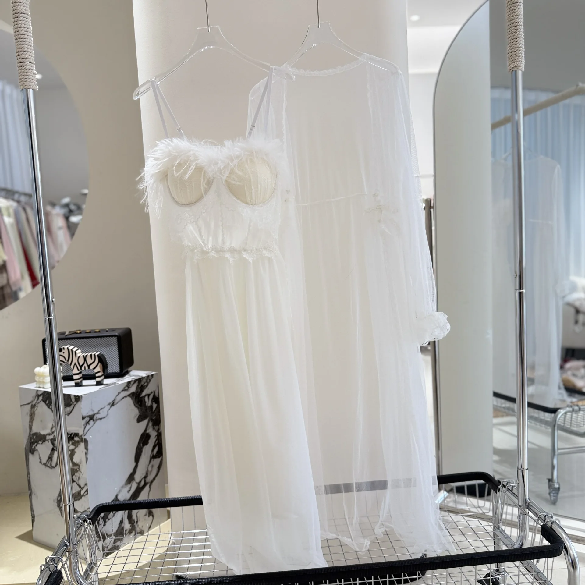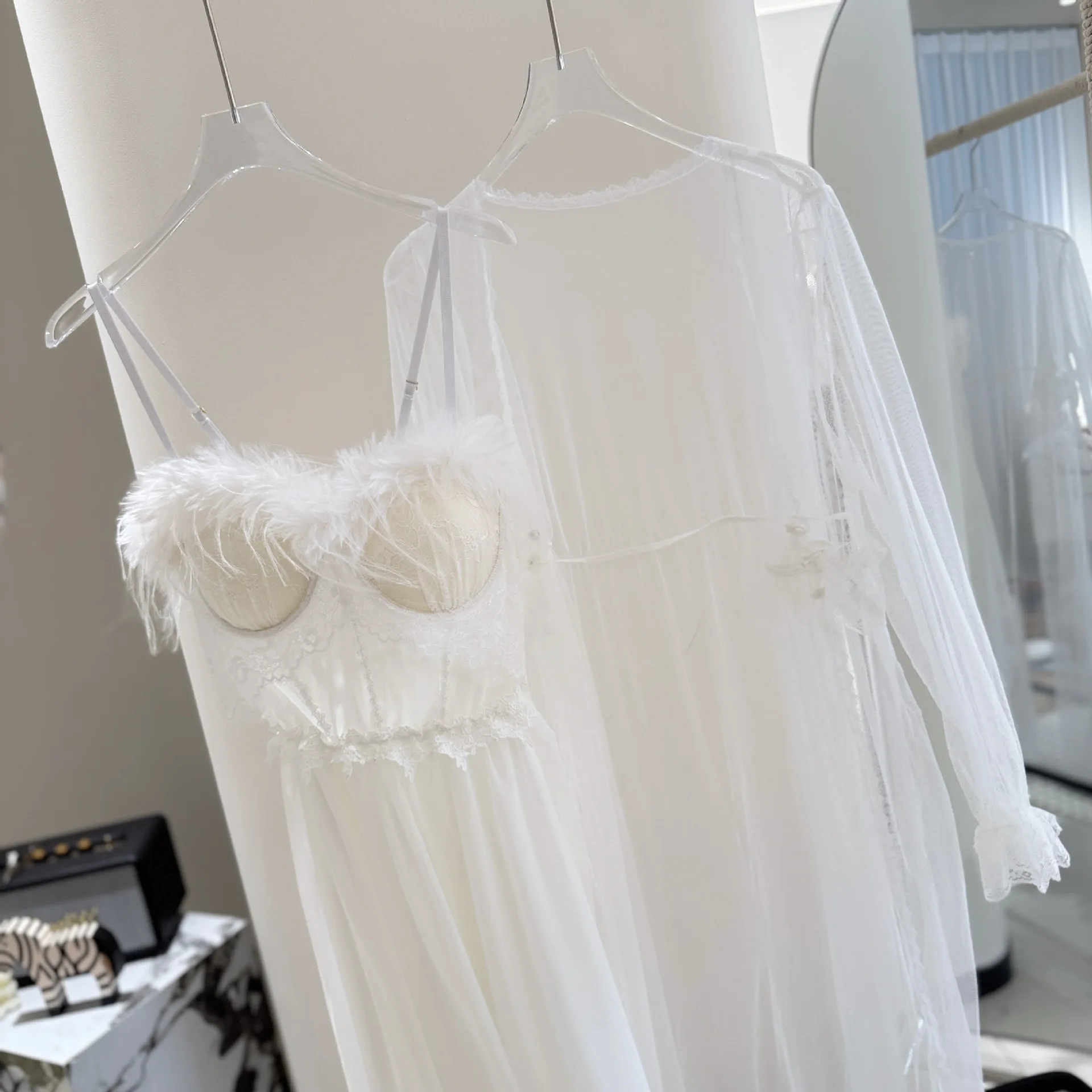 Fairy Wedding Robe Set Bride Morning Dressing Gown Sexy Mesh Perspective Robe Suit 2Pcs Spaghetti Strap Pajamas Lingerie