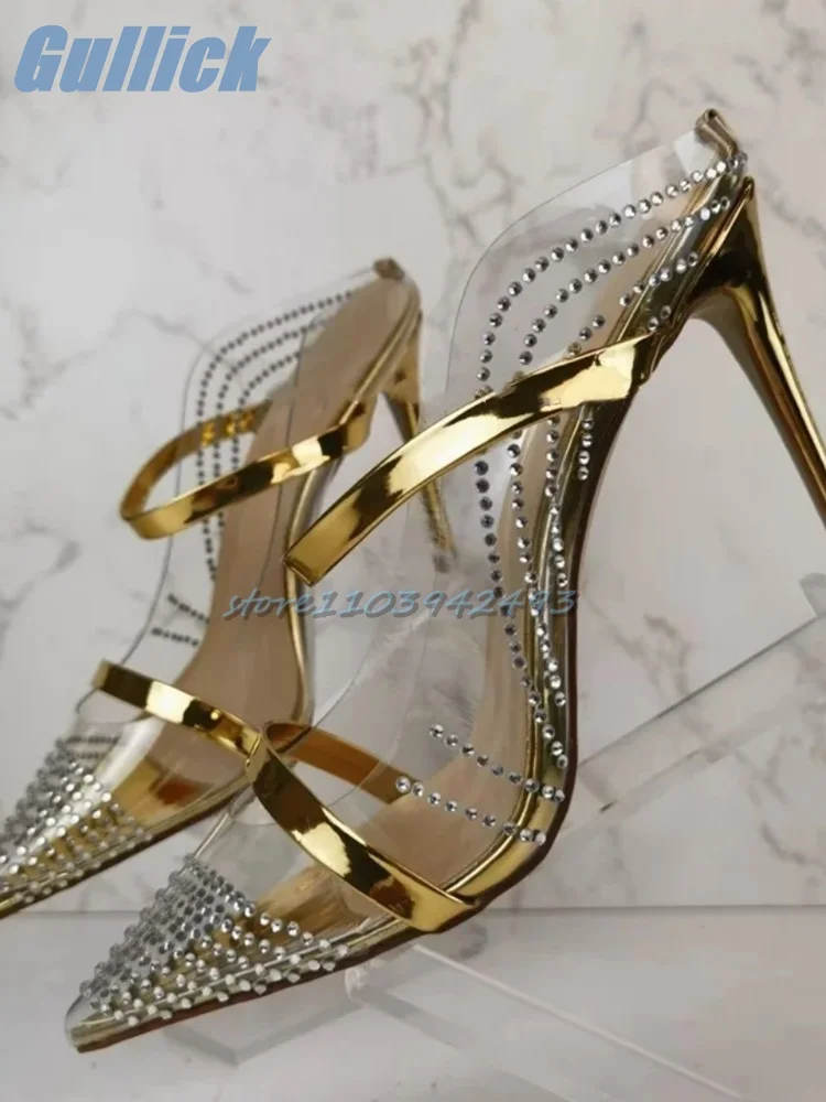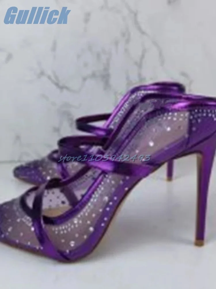 Feature: Glittering Golden Rhinestones Sandals Pointed Toe Stiletto Solid Purple Mules Summer Women Graceful Front Strappy