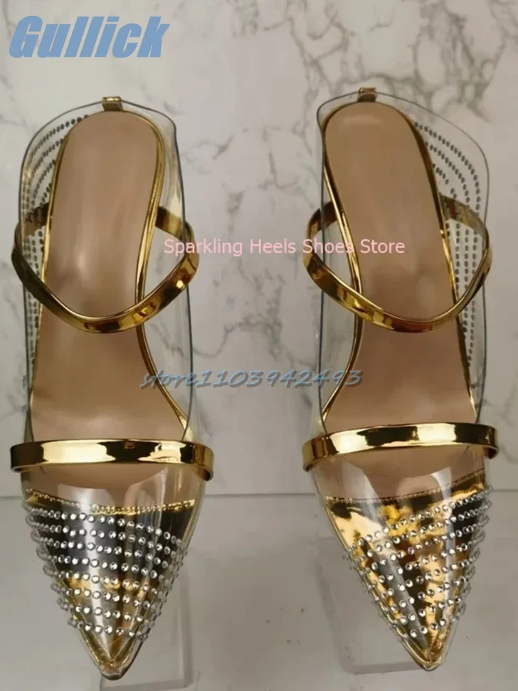Popular Element: Golden Rhinestones Sandals Pointed Toe Stiletto Solid Purple Mules Summer Women Graceful Front Strappy