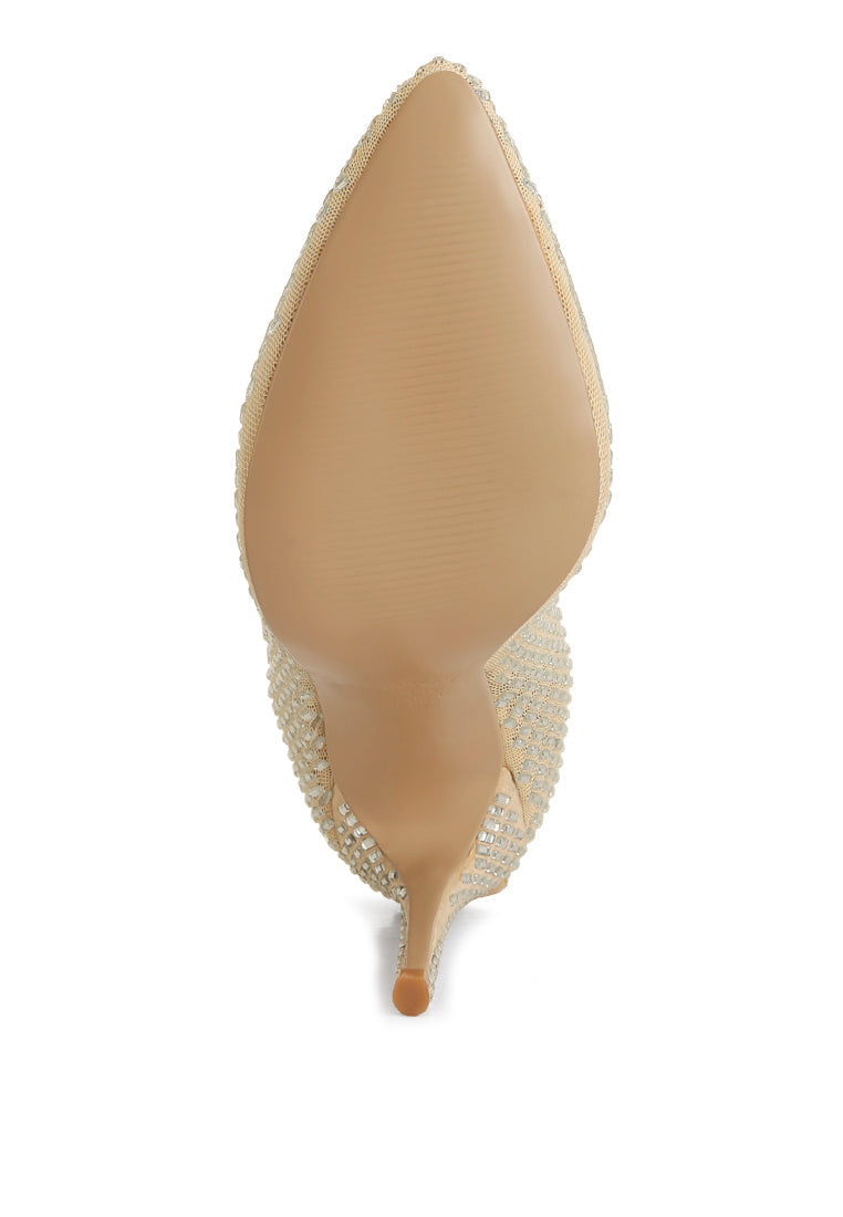 The world will be your runway wearing these drop-dead gorgeous rhinestones embellished boots. The sheer fabric is alluring while the rhinestones are dazzling and look absolutely ravishing. The high heel stilettos are also embellished and give the boots a sexy and sharp look!