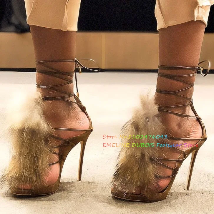 Fur Decor High Heel Ankle Boot Women Sexy Peep Toe Suede Stiletto Heel Lace Up Elegant Party Dress Sandals Ladies Summer Shoes