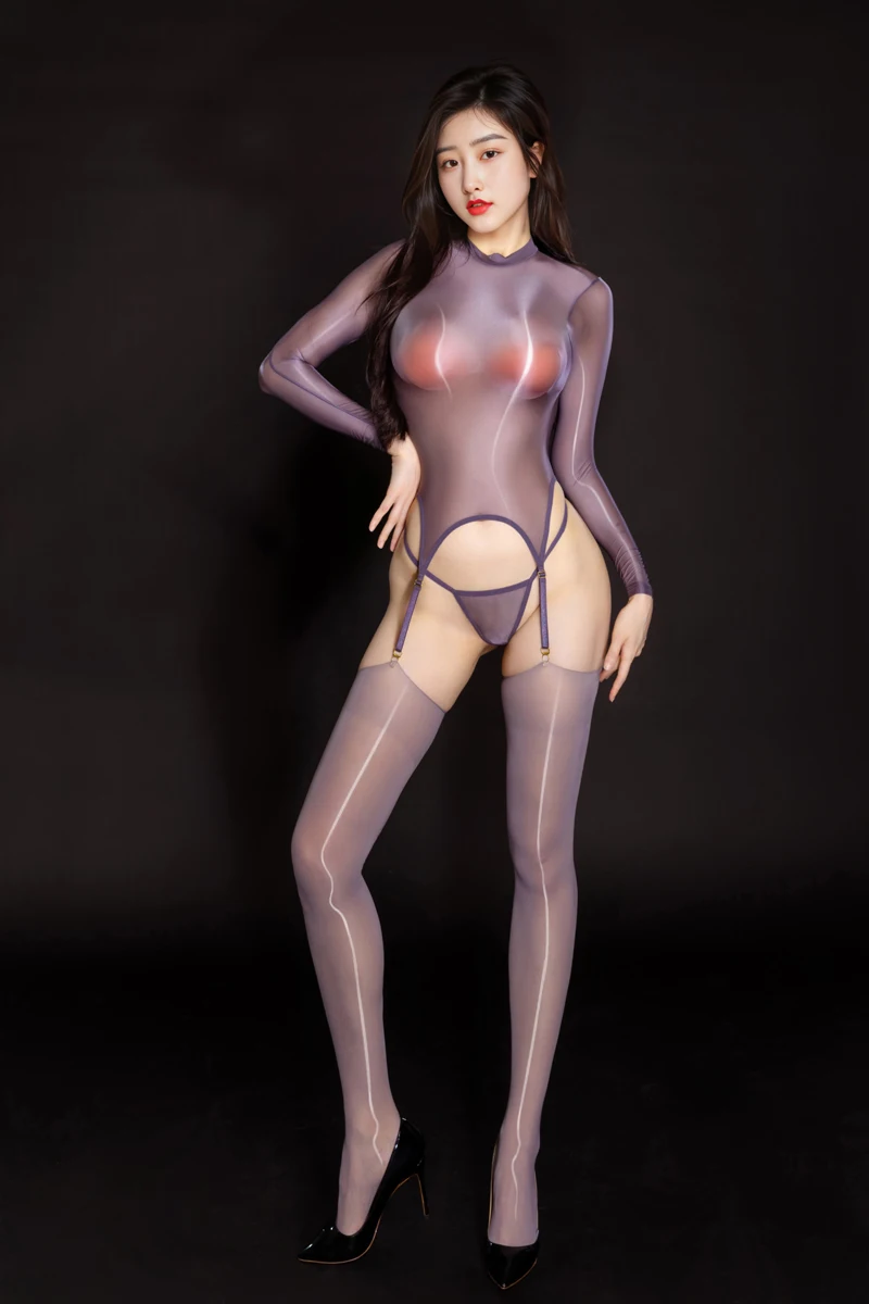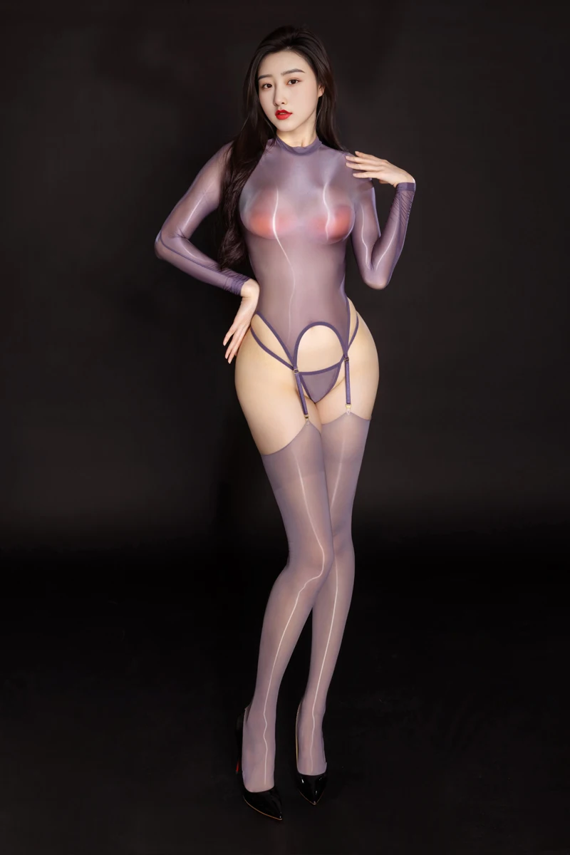 Glossy Shiny Outfit Crotchless Long Sleeve Bodysuit Tights Hot Sexy Transparent Clubwear Lingerie Stocking Body Garter Belt Set