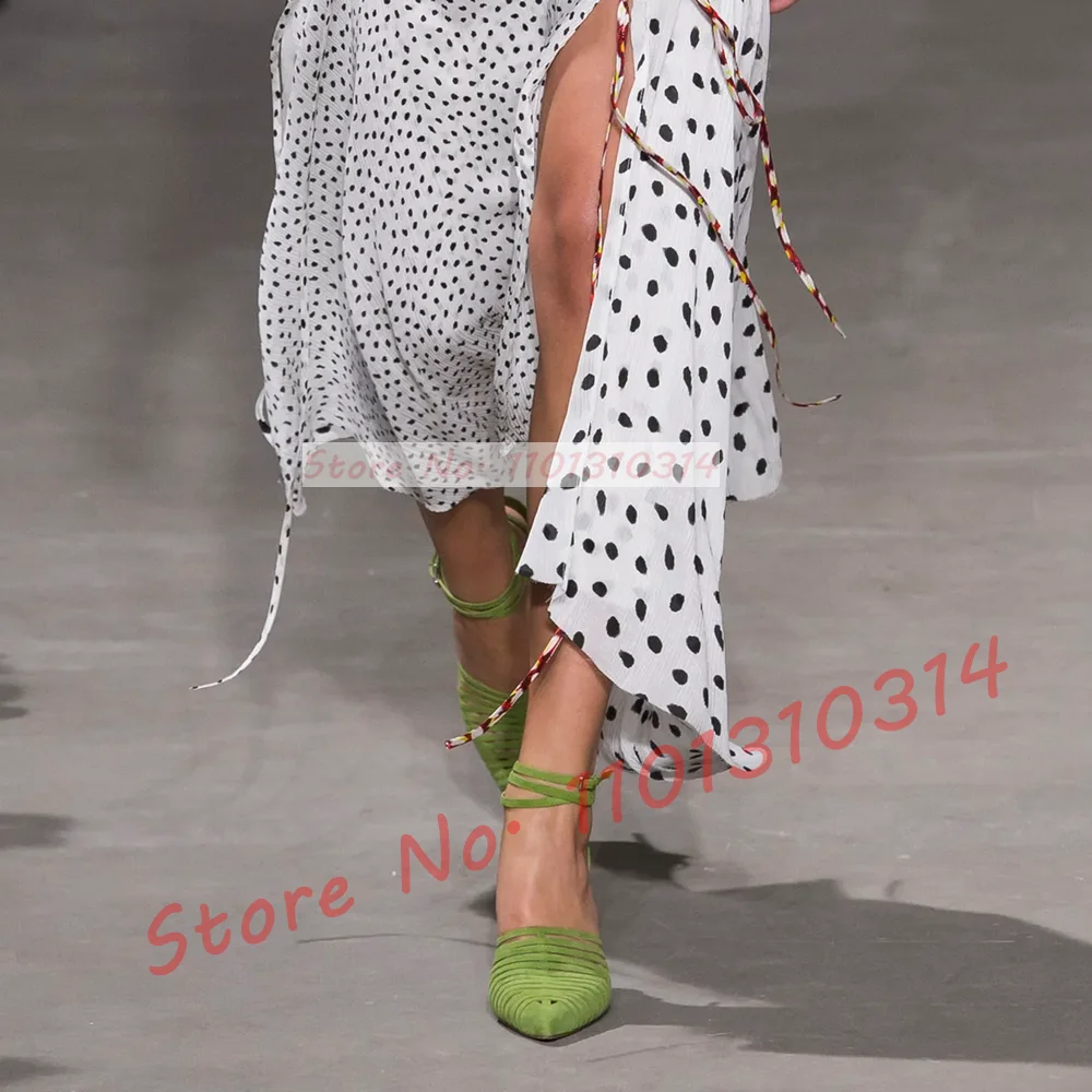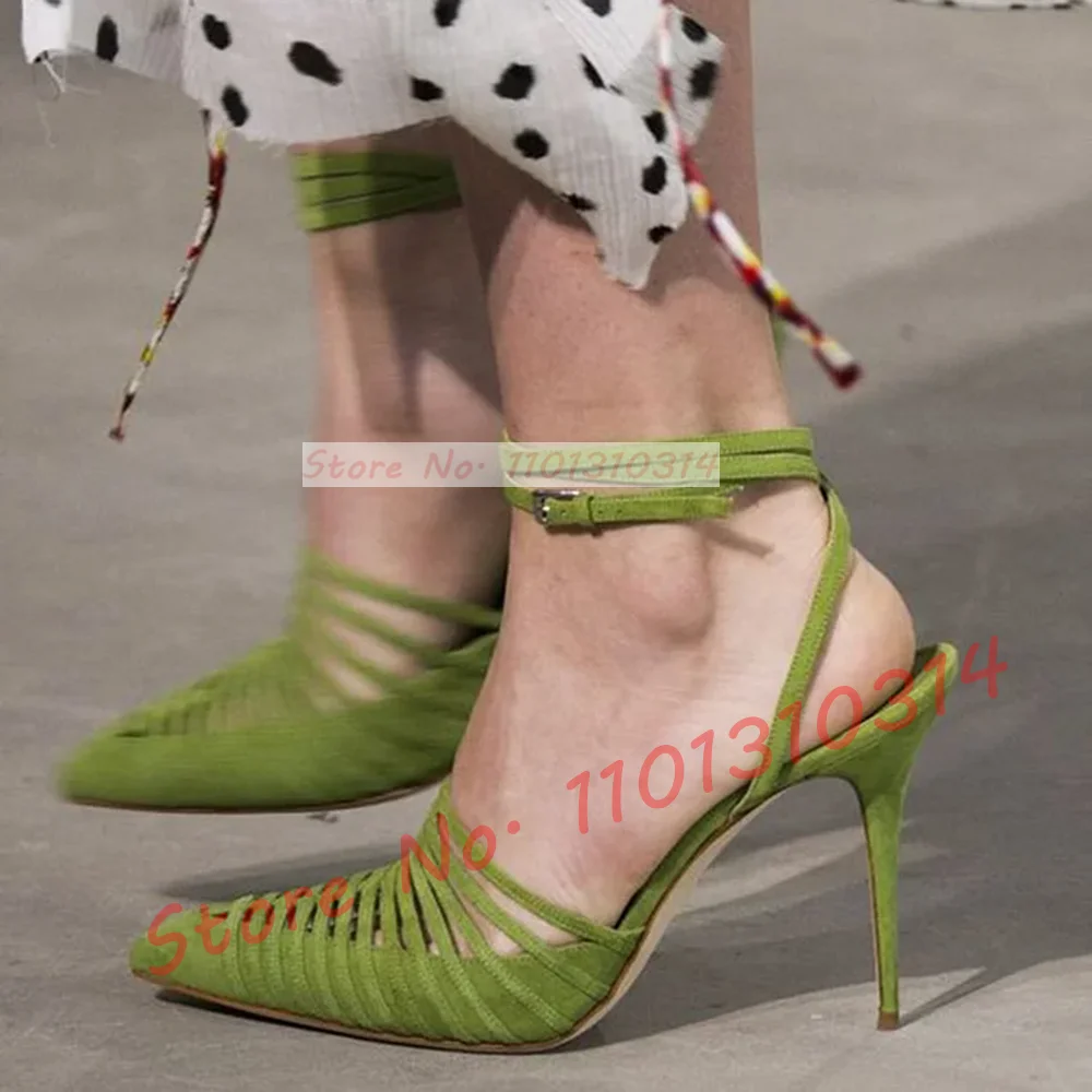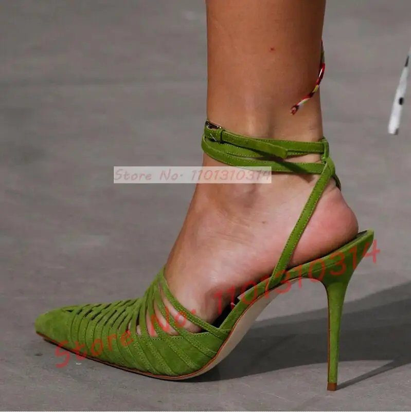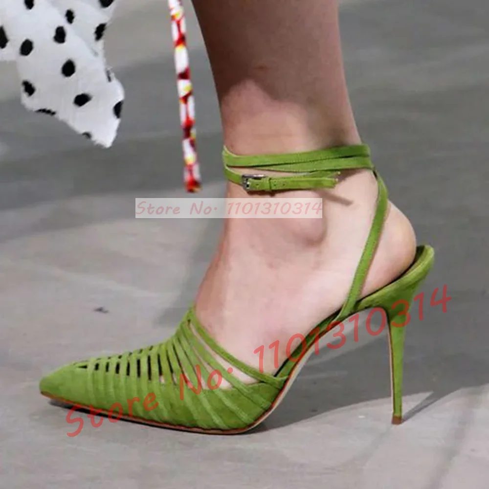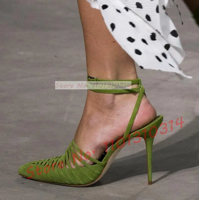 Green Vegan Suede Strappy Sandals Ladies Hollow Out Pointed Toe Mixed Color High Heels Shoes Women Party Trendy Chic Sandals
