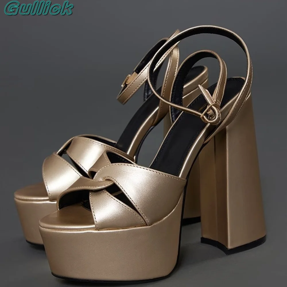 Gullick Gold Pu Sandals Open Toe High Heels Platform Ankle Buckle Strap Slingbacks Chunky Heels Square Heels Block Women Sandals