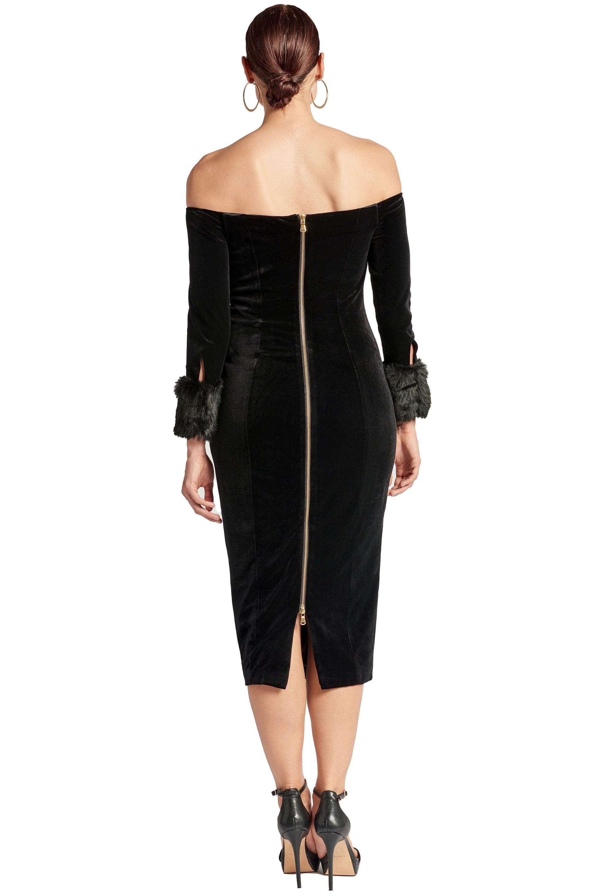 Joia Dress - Velvet off the shoulder long sleeve dress with faux fur