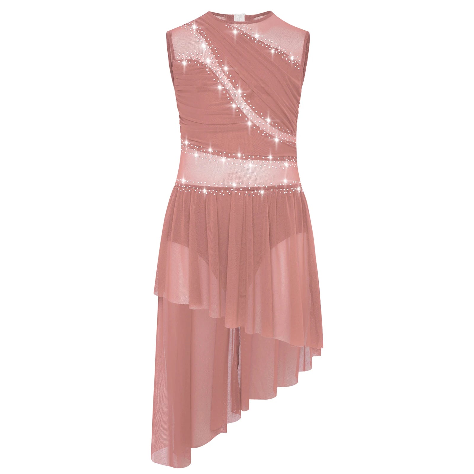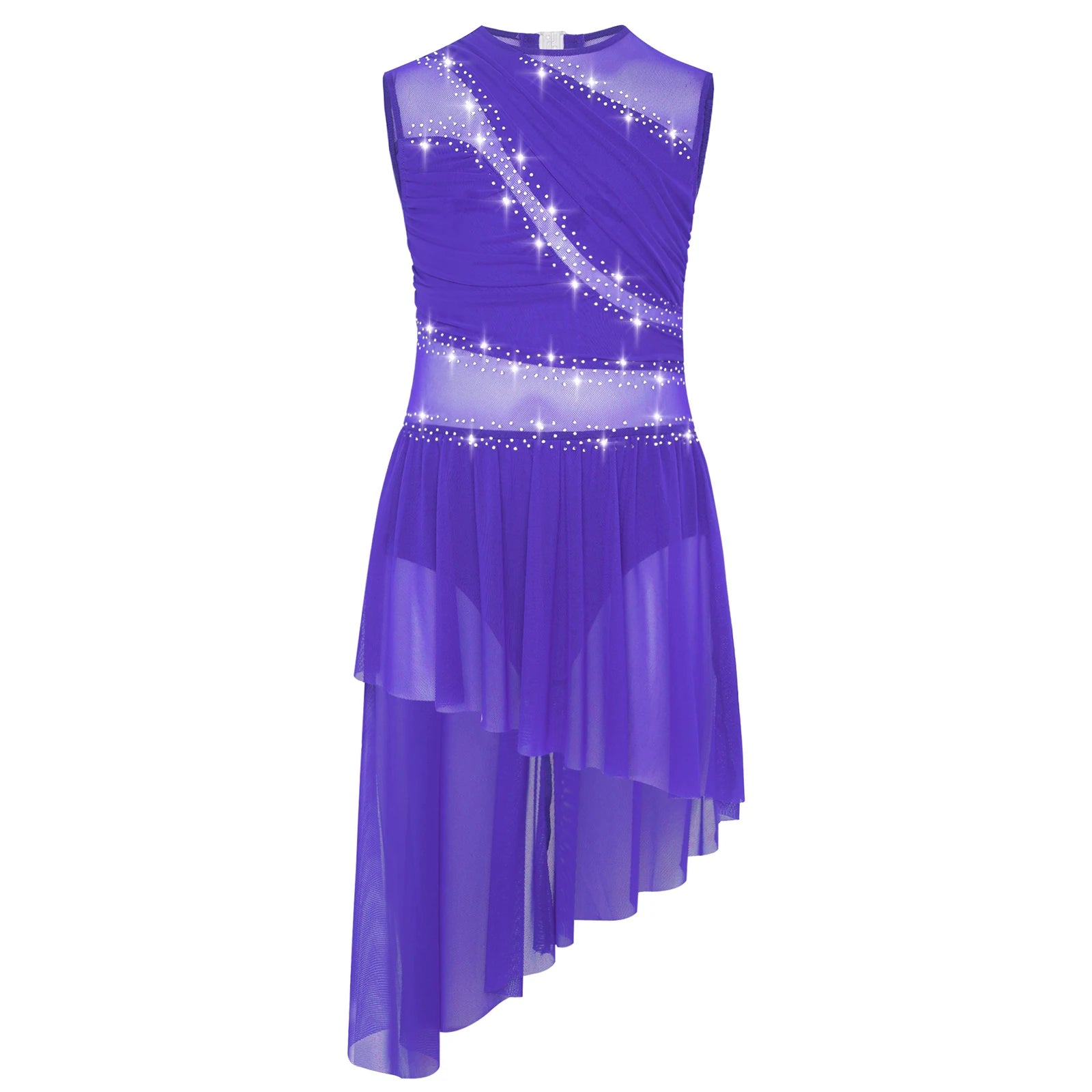 Kids Girls Ballet Dance Dress Figure Ice Skating Dancewear Open Back Asymmetrical Hem Rhinestone Sheer Gymnastics Leotard Dress