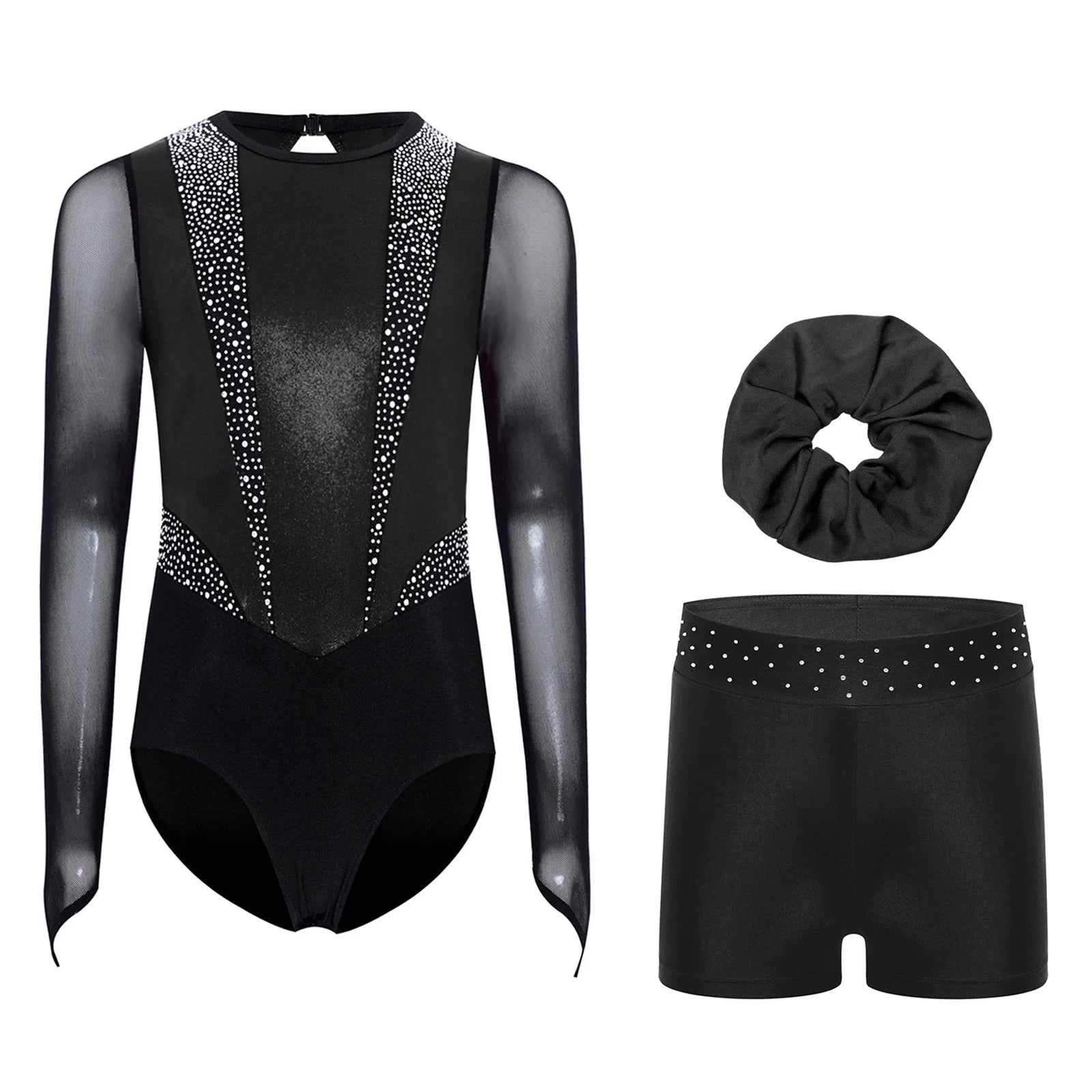 Kids Girls Ballet Gymnastics Sets Sports Tracksuit Figure Skating Dancewear Long Sleeves Rhinestones Leotard with Shorts Suit