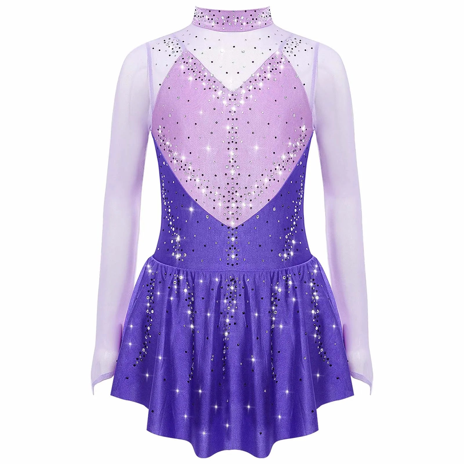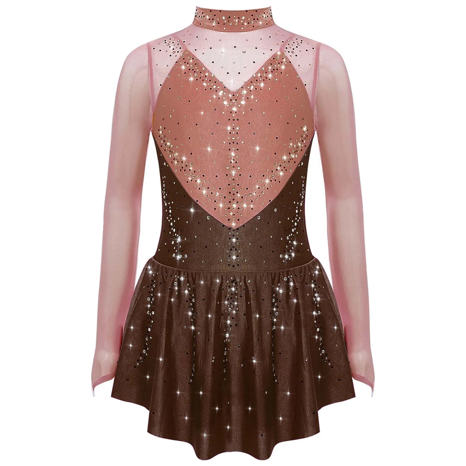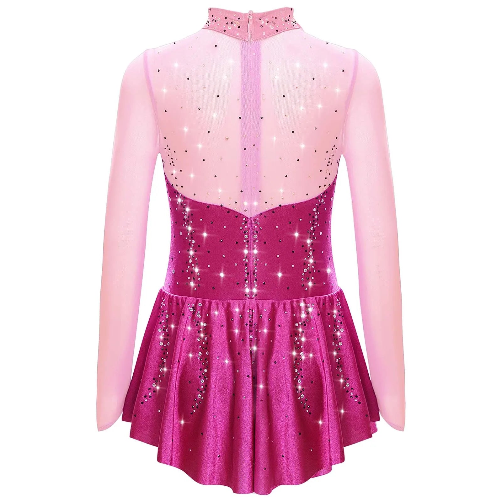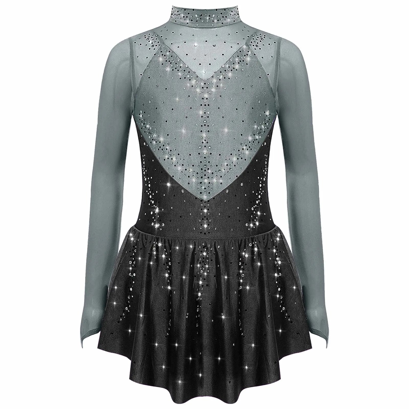 Kids Girls Figure Skating Dance Dress Ballet Lyrical Princess Costume Long Sleeve Color Block Mesh Rhinestones Leotard Dress