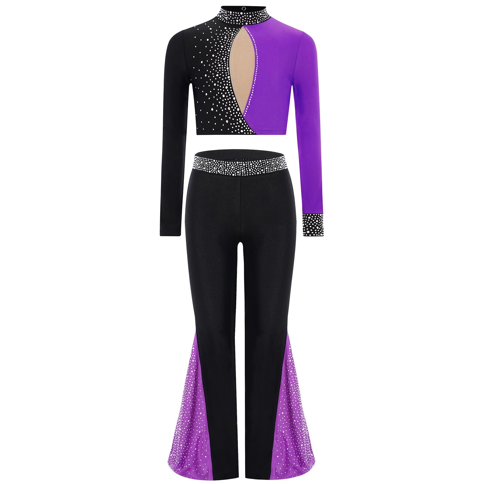 Kids Girls Lyrical Jazz Dance Costume Figure Skating Gymnastics Dancewear Long Sleeve Color Block Crop Top+Bell-Bottomed Pants