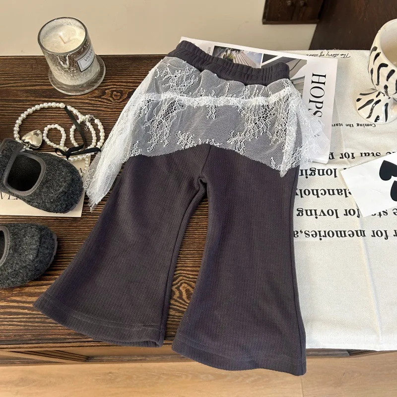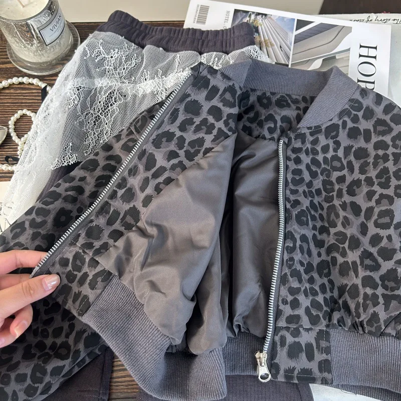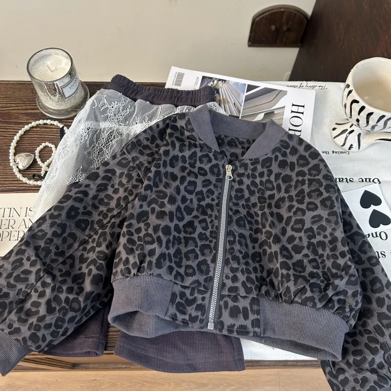 Korean Children Clothing 2025 New Autumn Girls Leopard Print Coat Children Stylish Fart Curtain Lace Flared Pants Two-piece Set