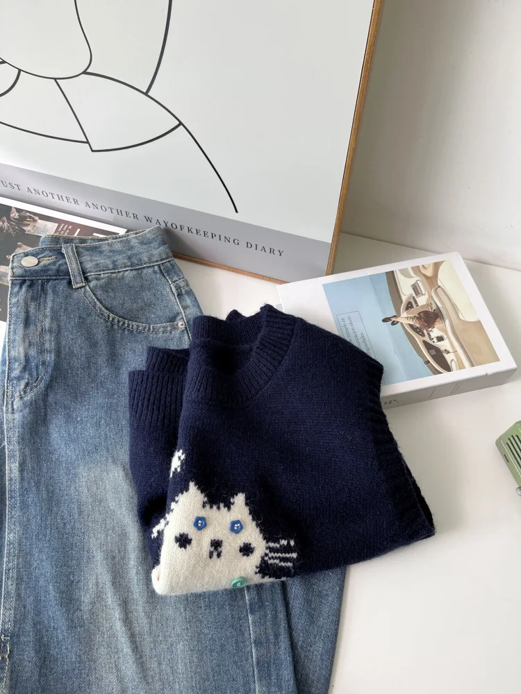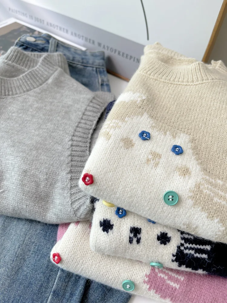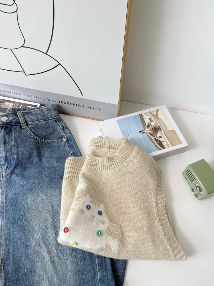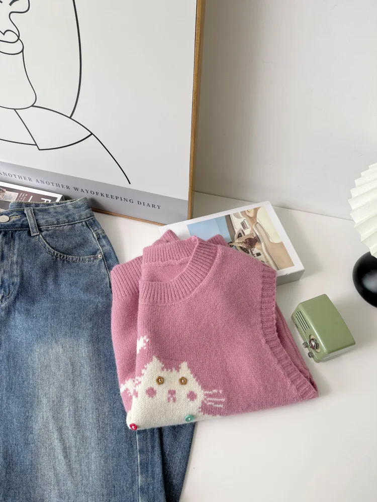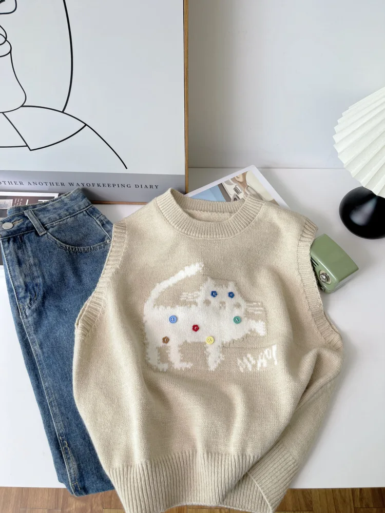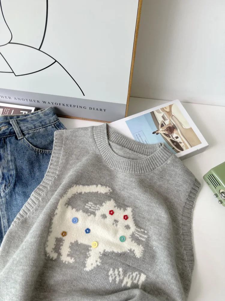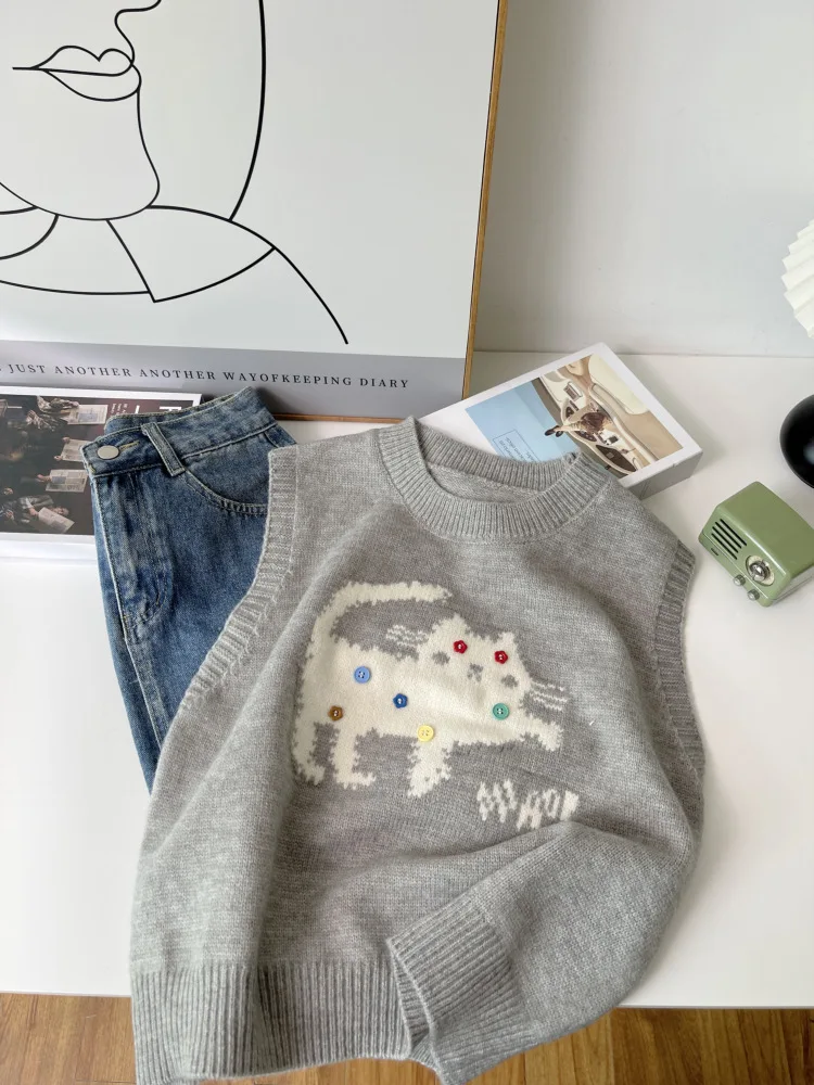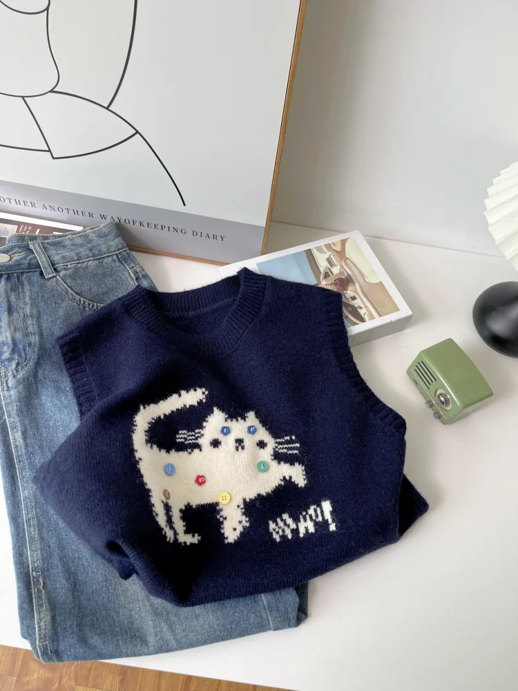 Korean Cute Cat Knitted Sweater Vest For Women 2025 New Colorful Buttons Round Neck Knitwear Loose Casual Versatile Pullovers