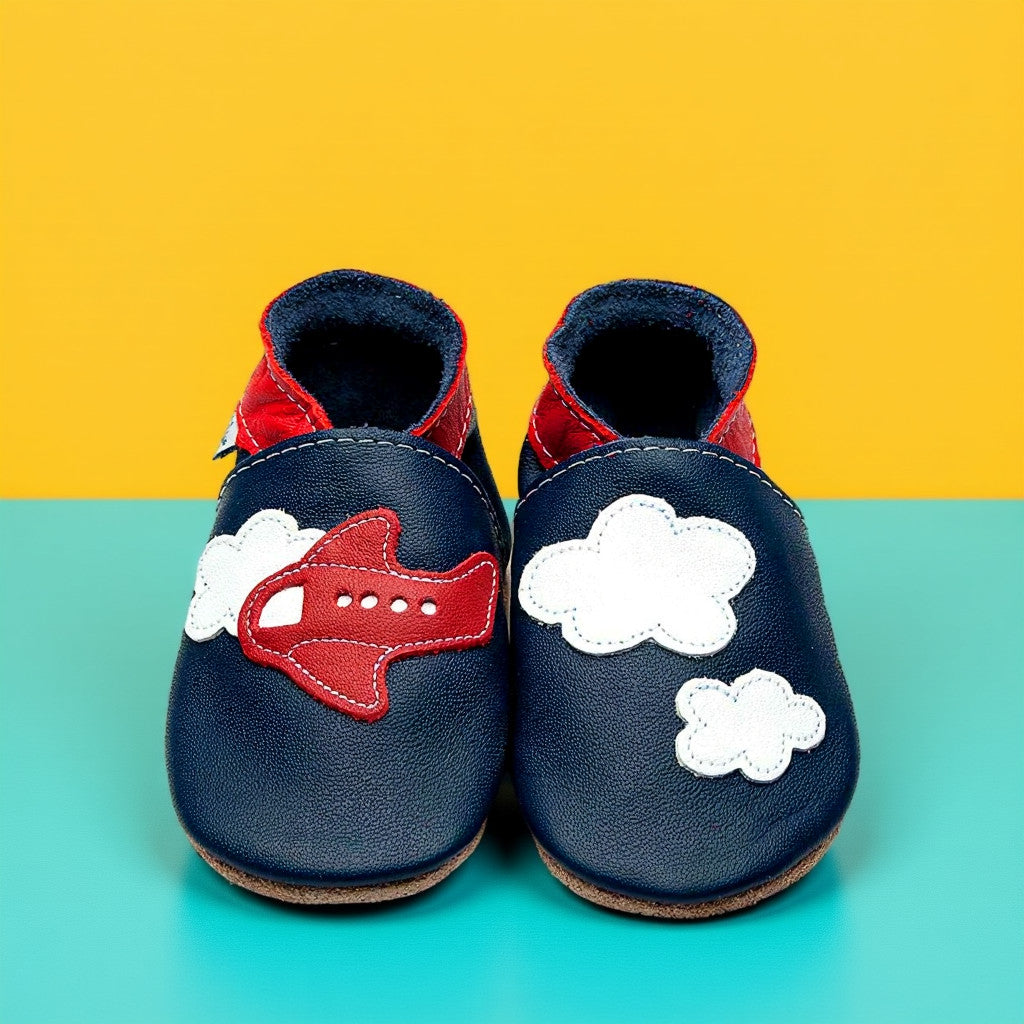 Leather Baby Shoes - Aeroplane Clouds Navy/Red - Inch Blue