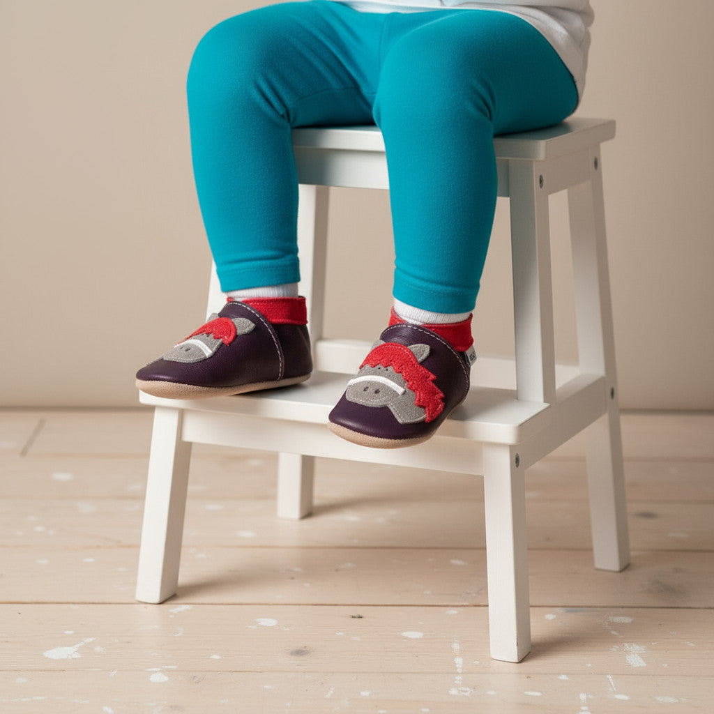 Soft violet purple leather baby shoes, thoughtfully designed for little ones. Each pair features a distinctive grey and red suede horse motif, adding a touch of character. Crafted for comfort and flexibility, the supple leather supports developing feet while offering durability. These shoes combine a unique aesthetic with everyday practicality, making them a stylish choice for your baby's first steps and beyond.