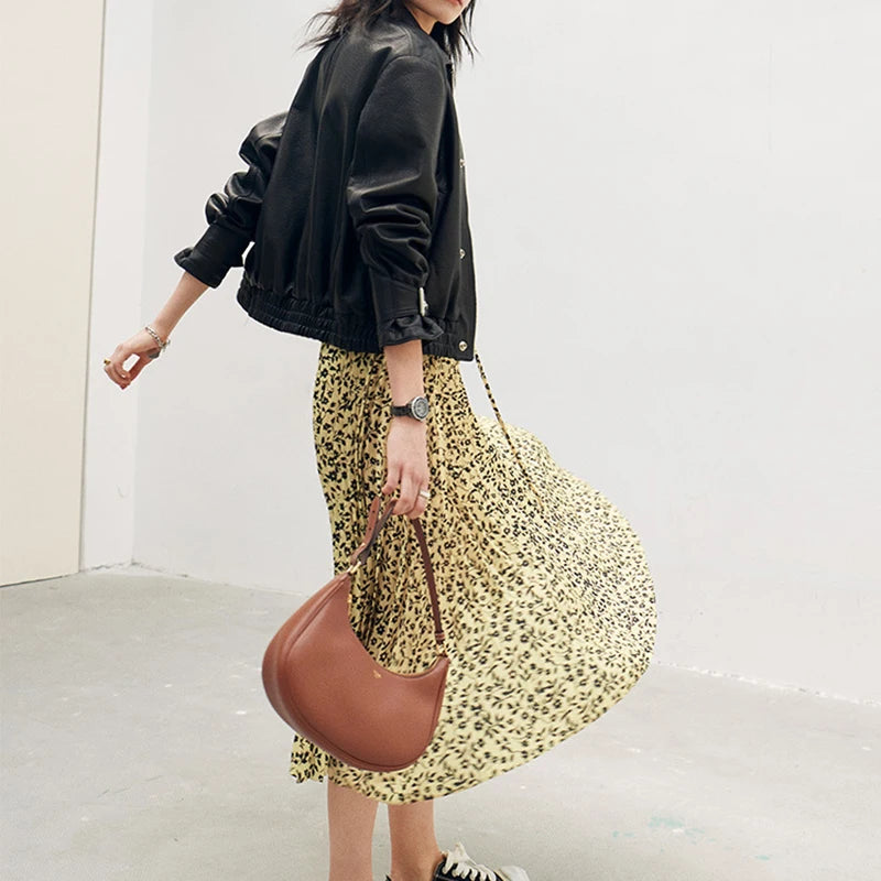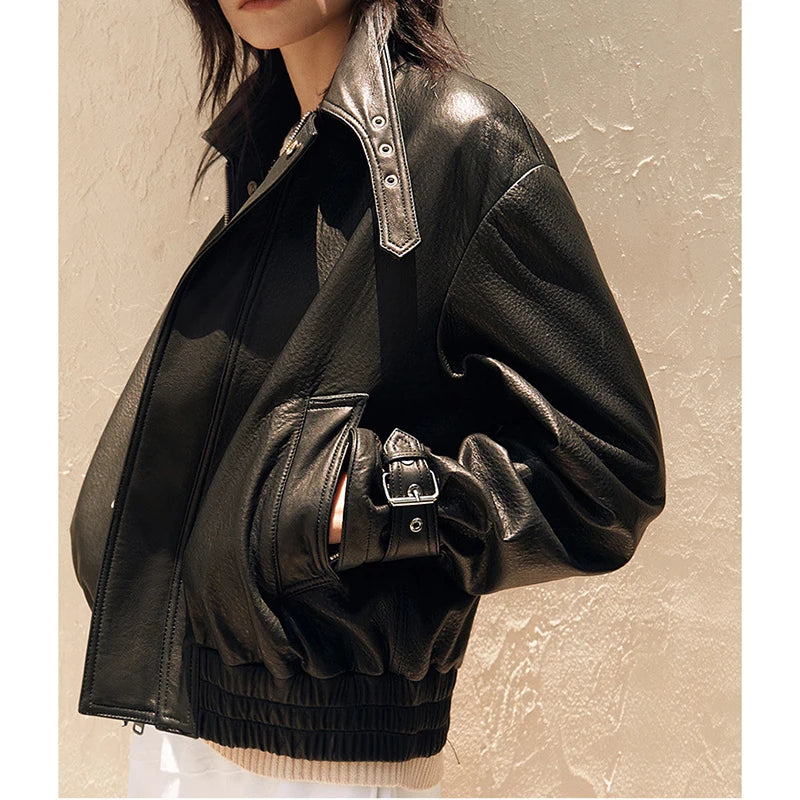 Leather Jacket for Women's Short Silm Harajuku Locomotive Casacos Feminino Real Sheepskin Single-Breasted Square Collar Outwears